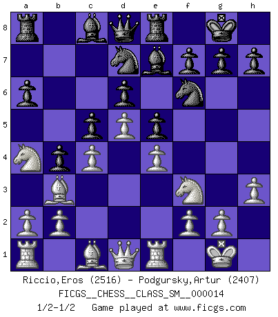 Last move : 1/2-1/2 2011 March 5 22:13:14 [Event "FICGS__CHESS__CLASS_SM__000014"] [Site "FICGS"] [Date "2011.02.18"] [Round "1"] [White "Riccio,Eros"] [Black "Podgursky,Artur"] [Result "1/2-1/2"] [WhiteElo "2516"] [BlackElo "2407"] 1.e4 e5 2.Nf3 Nc6 3.Bb5 a6 4.Ba4 Nf6 5.O-O Be7 6.Re1 b5 7.Bb3 O-O 8.h3 d6 9.c3 Nb8 10.d4 Nbd7 11.c4 c6 12.Nc3 b4 13.Na4 c5 14.d5 Re8 1/2-1/2 Ruy Lopez : Closed, 7...O-O Kingside Castling by player White (move 5) Kingside Castling by player Black (move 7) This chess game ended in a draw. Follow this game move after move (download)Not all artists are Chess players, but all Chess players are artists. (Marcel Duchamp) Über Frauen: Chess is better. (Robert James Fischer) El muchacho (en ese entonces un niño de 12 años llamado Anatoly Karpov) no tiene ni idea de lo que es el Ajedrez y no hay futuro en absoluto para el en esta profesión. (Mikhail Botvinnik) Avant la finale, les dieux ont créé le milieu de partie. (Tarrasch) Logic : The art of thinking and reasoning in strict accordance with the limitations and incapacities of the human misunderstanding. (Ambrose Bierce)
