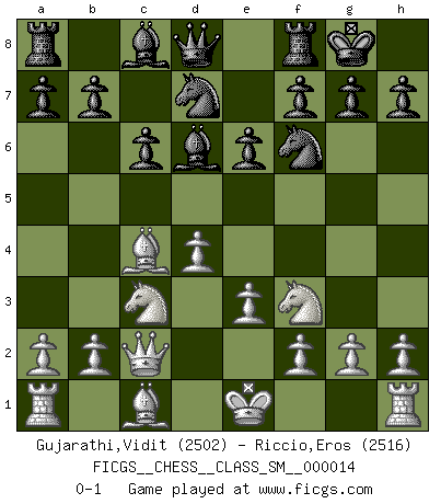 Last move : 0-1 2011 April 2 14:31:33 [Event "FICGS__CHESS__CLASS_SM__000014"] [Site "FICGS"] [Date "2011.02.18"] [Round "1"] [White "Gujarathi,Vidit"] [Black "Riccio,Eros"] [Result "0-1"] [WhiteElo "2502"] [BlackElo "2516"] 1.d4 d5 2.c4 c6 3.Nf3 Nf6 4.Nc3 e6 5.e3 Nbd7 6.Qc2 Bd6 7.Bd3 dxc4 8.Bxc4 O-O 0-1 This chess game has been lost on time (started : 2011.02.18 20:25:56) QGD Slav : 4.Nc3 Kingside Castling by player Black (move 8) Player Black won this chess game. Follow this game move after move (download)Methodical thinking is of more use in Chess than inspiration. (C. J. S. Purdy) Der Traum, für den ich lebe, ist der von einem freien Russland. Viele mögen sagen: Russland hat doch ein Parlament, einen gewählten Präsidenten. Aber ich spüre, dass in meiner Heimat die Angst wiederkehrt. Eine Angst, sich frei zu äußern, bestimmte Dinge zu tun (Garry Kasparov) Con el fin de mejorar tu juego, debes de estudiar los finales antes que todo, ya que mientras que los finales pueden ser estudiados y dominados por sí mismos, el juegomedio y la apertura deben de ser estudiados en relación con los finales. (José Raúl Capablanca) C'est la seule position que je connaisse où les deux camps sont mals. Propos prêtés à V. Anand. Statistics can be made to prove anything - even the truth. (Author unknown)
