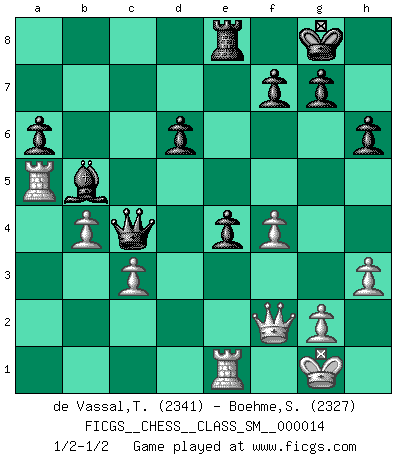 Last move : 1/2-1/2 2011 July 17 3:3:43 [Event "FICGS__CHESS__CLASS_SM__000014"] [Site "FICGS"] [Date "2011.02.18"] [Round "1"] [White "de Vassal,Thibault"] [Black "Boehme,Sebastian"] [Result "1/2-1/2"] [WhiteElo "2341"] [BlackElo "2327"] 1.e4 e5 2.Nf3 Nc6 3.Bb5 a6 4.Ba4 Nf6 5.O-O Be7 6.Re1 b5 7.Bb3 d6 8.c3 O-O 9.h3 Bb7 10.d4 Re8 11.Nbd2 Bf8 12.a3 h6 13.Bc2 d5 14.dxe5 Nxe5 15.Nxe5 Rxe5 16.f4 Bc5+ 17.Kh1 Nxe4 18.Nxe4 Rxe4 19.Bxe4 dxe4 20.Qe2 Bd6 21.a4 bxa4 22.Rxa4 Qh4 23.Kg1 Bc6 24.Ra5 Bb5 25.Qf2 Qe7 26.Be3 Rb8 27.b4 Re8 28.Bd4 Qe6 29.Be5 Qc4 30.Bxd6 cxd6 1/2-1/2 Ruy Lopez : Closed Kingside Castling by player White (move 5) Kingside Castling by player Black (move 8) This chess game ended in a draw. Follow this game move after move (download)Examine moves that smite! A good eye for smites is far more important than a knowledge of strategical principles. (Purdy) Ich organisiere ein großes Turnier, was mich etwa 120000 Dollar kostet. Ich denke, das ist das erste Mal in der Schachgeschichte, daß ein Schachgroßmeister auch als Mäzen auftritt. (Miguel Najdorf) Una compensación adecuada por un sacrificio es tener una combinación sólida que conduce a una posición ganadora; una compensación adecuada por una metida de pata es dejar a tu oponente arrebatar una derrota de las fauces de la victoria. (Bruce A. Moon) La tactique, c'est ce que vous faites quand il y a quelque chose à faire; la stratégie, c'est ce que vous faites quand il n'y a rien à faire. (Savielli Tartacower) Chess, like love, like music, has the power to make people happy. (Siegbert Tarrasch)