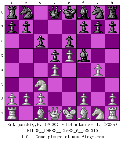 Last move : 1-0 2007 January 16 6:25:48 [Event "FICGS__CHESS__CLASS_A__000010"] [Site "FICGS"] [Date "2006.12.06"] [Round "1"] [White "Kotlyanskiy,Edward"] [Black "Ozbostanlar,Ozgur"] [Result "1-0"] [WhiteElo "2000"] [BlackElo "2025"] 1.e4 c6 2.d4 d5 3.e5 Bf5 4.Nc3 e6 5.g4 1-0 This chess game has been lost on time (started : 2006.12.06 23:1:9) Caro-Kann : Advance variation Player White won this chess game. Follow this game move after move (download)I have never in my life played the French Defence, which is the dullest of all openings. (Wilhelm Steinitz) Obwohl ich vom Stil her kaum zu den Priestern der Schachkunst gezählt werde, halte ich Schach doch für eine Kunst. (Tigran Petrosjan) Durante una competencia de Ajedrez, un Maestro de Ajedrez deberá ser una combinación de presa de caza y un Monge. (Alexander Alekhine) La menace est plus forte que l'exécution. (Aaron Nimzovitch) If I had no sense of humor, I would long ago have committed suicide. (Mahatma Gandhi)