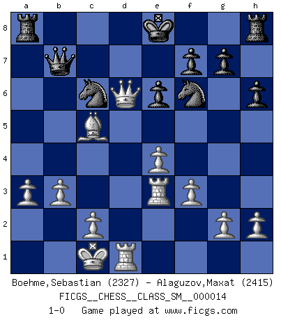 Last move : 1-0 2011 August 1 21:4:40 [Event "FICGS__CHESS__CLASS_SM__000014"] [Site "FICGS"] [Date "2011.02.18"] [Round "1"] [White "Boehme,Sebastian"] [Black "Alaguzov,Maxat"] [Result "1-0"] [WhiteElo "2327"] [BlackElo "2415"] 1.e4 c5 2.Nf3 d6 3.d4 cxd4 4.Nxd4 Nf6 5.Nc3 a6 6.Be3 e6 7.Be2 Qc7 8.Qd2 b5 9.a3 Bb7 10.f3 Nc6 11.O-O-O Be7 12.Ndxb5 axb5 13.Nxb5 Qc8 14.Nxd6+ Bxd6 15.Qxd6 Ba6 16.Rhe1 Qb7 17.Bxa6 Qxa6 18.Bc5 h6 19.b3 Qb7 20.Re3 1-0 This chess game has been lost on time (started : 2011.02.18 20:25:56) Sicilian : Najdorf, Byrne (English) attack Queenside Castling by player White (move 11) Player White won this chess game. Follow this game move after move (download)He who takes the Queen's Knight's Pawn will sleep in the streets. (Anonymous) Schach ist ein Kampf gegen den Fehler. (Johannes Herrman Zukertort) La única cosa que los jugadores de Ajedrez tienen en común, es el Ajedrez. (Lodewijk Prins) Mais l'homme est une créature légère et illogique : semblable au joueur d'échecs, il n'aime que le processus du but à atteindre, non le but lui-même. (Dostoïevsky) It is not titles that honor men, but men that honor titles. (Niccolo Machiavelli)