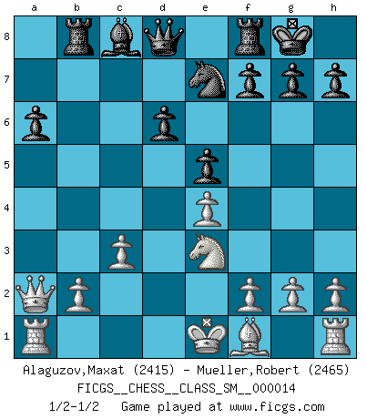 Last move : 1/2-1/2 2011 June 26 21:7:6 [Event "FICGS__CHESS__CLASS_SM__000014"] [Site "FICGS"] [Date "2011.02.18"] [Round "1"] [White "Alaguzov,Maxat"] [Black "Mueller,Robert"] [Result "1/2-1/2"] [WhiteElo "2415"] [BlackElo "2465"] 1.e4 c5 2.Nf3 Nc6 3.d4 cxd4 4.Nxd4 Nf6 5.Nc3 e5 6.Ndb5 d6 7.Bg5 a6 8.Na3 b5 9.Nd5 Be7 10.Bxf6 Bxf6 11.c3 Bg5 12.Nc2 Rb8 13.a4 bxa4 14.Nce3 O-O 15.Qxa4 Bxe3 16.Nxe3 Ne7 17.Qa2 1/2-1/2 Sicilian : Pelikan (Lasker/Sveshnikov) variation Kingside Castling by player Black (move 14) This chess game ended in a draw. Follow this game move after move (download)I thought the most common mistake [in chess] was the first one: Learning the game :P (Garvin Gray, FICGS forum) Das Zentrum ist der Balkan des Schachbretts - Kriegshandlungen können in jedem Moment ausbrechen. (Aaron Nimzowitsch) El hombre es un frívolo, una creatura engañosa y como un jugador de Ajedrez, se preocupa mas por el proceso de obtener su meta que de la meta por sí misma. (Dostoyevsky) J'ai vu le vaincu d'Echecs jouer des années durant dans l'espoir de la fête de la victoire. Car tu es plus riche de ce qu'elle existe si même elle n'est point pour toi. Ainsi de la perle du fond des mers. (Antoine de Saint-Exupéry) If I had no sense of humor, I would long ago have committed suicide. (Mahatma Gandhi)