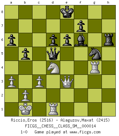 Last move : 1-0 2011 September 14 10:19:21 [Event "FICGS__CHESS__CLASS_SM__000014"] [Site "FICGS"] [Date "2011.02.18"] [Round "1"] [White "Riccio,Eros"] [Black "Alaguzov,Maxat"] [Result "1-0"] [WhiteElo "2516"] [BlackElo "2415"] 1.e4 c5 2.Nf3 d6 3.d4 cxd4 4.Nxd4 Nf6 5.Nc3 a6 6.Bg5 e6 7.f4 Nbd7 8.Qe2 Qc7 9.O-O-O b5 10.a3 Bb7 11.g4 Be7 12.Kb1 h6 13.Bh4 Rc8 14.Rg1 g5 15.fxg5 hxg5 16.Bxg5 Qb6 17.Qe1 Rxc3 18.Bxf6 Nxf6 19.Qxc3 Nxe4 20.Qe1 Bf6 21.c3 Rxh2 22.g5 Nxg5 23.Qg3 Rh6 24.Qe3 Qc5 25.Bg2 Bxg2 26.Rxg2 Qd5 27.Rg4 1-0 This chess game has been lost on time (started : 2011.02.18 20:25:56) Sicilian : Najdorf, 7.f4 Queenside Castling by player White (move 9) Player White won this chess game. Follow this game move after move (download)Many Chess players were surprised when after the game, Fischer quietly explained: 'I had already analyzed this possibility' in a position which I thought was not possible to foresee from the opening. (Mikhail Tal) Pläne sind die Träume des Verständigen. (Ernst Freiherr von Feuchtersleben) El estómago es una parte esencial del maestro de Ajedrez. (Bent Larsen) Le joueur d'Echecs qui veut atteindre le top est obligé de développer son propre credo créatif. Alexeï Stepanovicth Souétine. Il est facile d'écrire des livres ! Ce qui est difficile, c'est de jouer ! (Alexeï Stepanovicth Souétine) A government big enough to give you everything you want is strong enough to take everything you have. (Thomas Jefferson)