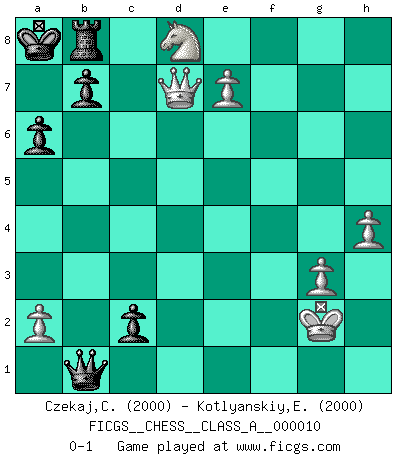 Last move : 0-1 2007 January 21 22:55:29 [Event "FICGS__CHESS__CLASS_A__000010"] [Site "FICGS"] [Date "2006.12.06"] [Round "1"] [White "Czekaj,Christophe"] [Black "Kotlyanskiy,Edward"] [Result "0-1"] [WhiteElo "2000"] [BlackElo "2000"] 1.e4 c5 2.Nc3 Nc6 3.f4 g6 4.Nf3 Bg7 5.Bb5 Nd4 6.O-O Nxb5 7.Nxb5 d6 8.d3 Nf6 9.Nc3 O-O 10.Qe1 Bd7 11.Qh4 Bc6 12.f5 Qb6 13.Kh1 gxf5 14.Ne2 fxe4 15.Ng5 Rfe8 16.Rxf6 exf6 17.Qxh7+ Kf8 18.Nxe4 Bxe4 19.dxe4 d5 20.Bh6 Bxh6 21.Qxh6+ Ke7 22.Nf4 Qxb2 23.Rd1 Kd6 24.Qh5 Re5 25.Qxf7 Qxc2 26.Qxf6+ Kd7 27.Rxd5+ Rxd5 28.Qe6+ Kd8 29.Qxd5+ Kc7 30.g3 Kb6 31.Ne6 a6 32.h4 Rc8 33.Nd8 Qb1+ 34.Kg2 Ka7 35.e5 c4 36.e6 c3 37.Qd4+ Ka8 38.Qd7 Rb8 39.e7 c2 0-1 Sicilian : Grand Prix attack Kingside Castling by player White (move 6) Kingside Castling by player Black (move 9) Player Black won this chess game. Follow this game move after move (download)A win by an unsound combination, however showy, fills me with artistic horror. (Wilhelm Steinitz) Wenn Dein Gegner dir ein Remis anbietet, versuch herauszufinden, weshalb er glaubt schlechter zu stehen. (Nigel Short) Ser exitoso en el Ajedrez te permite descubrir tu propia personalidad. Eso es lo que deseo para los niños de mi clase. (Saudin Robovic) A ce moment-là, je menaçais de comprendre la position ! (Clément L'Heureux) It's not the size of the dog in the fight, it's the size of the fight in the dog. (Mark Twain)