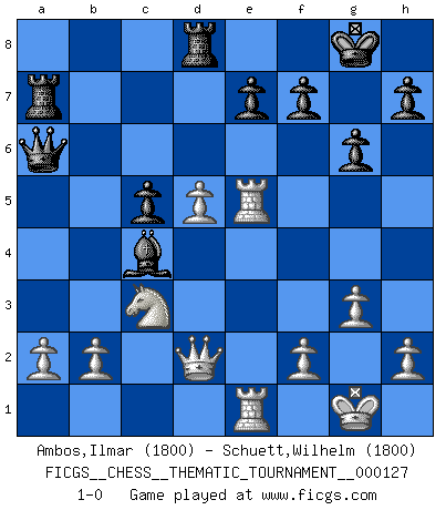 Last move : 1-0 2011 May 2 4:3:56 [Event "FICGS__CHESS__THEMATIC_TOURNAMENT__000127"] [Site "FICGS"] [Date "2011.02.19"] [Round "1"] [White "Ambos,Ilmar"] [Black "Schuett,Wilhelm"] [Result "1-0"] [WhiteElo "1800"] [BlackElo "1800"] 1.d4 Nf6 2.c4 c5 3.d5 b5 4.cxb5 a6 5.bxa6 Bxa6 6.Nc3 d6 7.g3 Nbd7 8.Nf3 g6 9.Bg2 Bg7 10.O-O Nb6 11.Re1 O-O 12.e4 Nfd7 13.Qc2 Nc4 14.Bf1 Qa5 15.Bxc4 Bxc4 16.Bg5 Rfe8 17.Bd2 Qa6 18.Bf4 Reb8 19.e5 Ra7 20.Qd2 dxe5 21.Bxe5 Nxe5 22.Nxe5 Bxe5 23.Rxe5 Rd8 24.Rae1 1-0 Benko gambit accepted Kingside Castling by player White (move 10) Kingside Castling by player Black (move 11) Player White won this chess game. Follow this game move after move (download)Place the contents of the Chess box in a hat, shake them up vigorously, pour them on the board from a height of two feet, and you get the style of Steinitz. (H. E. Bird) Wenn du nicht weißt was du tun sollst, warte bis dein Gegner eine Idee hat. Sie wird sicher schlecht sein. (Siegbert Tarrasch) Un buen sacrificio es aquel que aunque no sea necesariamente sólido, deja a tu oponente aturdido y confuso. (Rudolph Spielmann) J'ai toujours senti une vague pitié pour l'homme qui ne connaît rien aux échecs, tout comme j'en aurais pour un homme ignorant de l'amour. Les Echecs, comme la musique ou comme l'amour, ont le pouvoir de rendre heureux. (Siegbert Tarrasch) The difference between stupidity and genius is that genius has its limits. (Murphy)