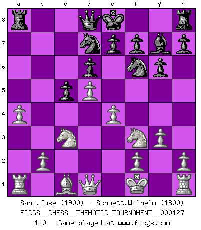 Last move : 1-0 2011 April 1 2:13:59 [Event "FICGS__CHESS__THEMATIC_TOURNAMENT__000127"] [Site "FICGS"] [Date "2011.02.19"] [Round "1"] [White "Sanz,Jose"] [Black "Schuett,Wilhelm"] [Result "1-0"] [WhiteElo "1900"] [BlackElo "1800"] 1.d4 Nf6 2.c4 c5 3.d5 b5 4.cxb5 a6 5.bxa6 g6 6.Nc3 Bxa6 7.e4 Bxf1 8.Kxf1 d6 9.Nf3 Nbd7 10.g3 Bg7 11.a4 1-0 Benko gambit accepted Player White won this chess game. Follow this game move after move (download)A passed Pawn increases in strength as the number of pieces on the board diminishes. (Capablanca) Kasparov ist eine Art Monster mit hundert Augen, denen auch nicht das Geringste entgeht. (Tony Miles) Un buen jugador siempre tiene buena suerte. (José Raúl Capablanca) Aucun coup ne doit être joué sans but. (Pedro Damiano) An expert is a man who has made all the mistakes which can be made in a very narrow field. (Niels Bohr)