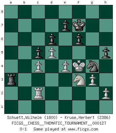Last move : 0-1 2011 May 2 3:15:34 [Event "FICGS__CHESS__THEMATIC_TOURNAMENT__000127"] [Site "FICGS"] [Date "2011.02.19"] [Round "1"] [White "Schuett,Wilhelm"] [Black "Kruse,Herbert"] [Result "0-1"] [WhiteElo "1800"] [BlackElo "2386"] 1.d4 Nf6 2.c4 c5 3.d5 b5 4.cxb5 a6 5.bxa6 g6 6.Nf3 Bxa6 7.Nc3 d6 8.Nd2 Bg7 9.e4 Bxf1 10.Nxf1 Qa5 11.Nd2 Nh5 12.Qc2 Bxc3 13.Qxc3 Qxc3 14.bxc3 Ra4 15.O-O Nd7 16.Bb2 Nf4 17.Rfb1 f6 18.Kf1 g5 19.g3 Nd3 20.Ke2 N7e5 21.c4 Nxb2 22.Rxb2 Kf7 23.Rc1 Rha8 24.R1c2 g4 25.Ke3 Ra3+ 26.Rb3 Rxa2 27.Rbc3 h5 28.f4 gxf3 29.Nxf3 Ng4+ 30.Kf4 Rxc2 31.Rxc2 Ra3 0-1 Benko gambit accepted Kingside Castling by player White (move 15) Player Black won this chess game. Follow this game move after move (download)After a bad opening, there is hope for the middle game. After a bad middle game, there is hope for the endgame. But once you are in the endgame, the moment of truth has arrived. (Edmar Mednis) Schach ist Kampf, hauptsächlich jedoch gegen die eigenen Fehler. (Savielly Grigorievitsch Tartakower) El jugador táctico sabe que hacer cuando hay algo que hacer; mientras que el estratega sabe que hacer cuando no hay nada que hacer. (Gerald Abrahams) Les erreurs sont comme les malheurs, elles n'arrivent jamais seules. (Siegbert Tarrasch) Computers are like Old Testament gods; lots of rules and no mercy. (Joseph Campbell)