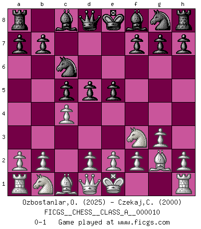 Last move : 0-1 2007 January 19 6:44:0 [Event "FICGS__CHESS__CLASS_A__000010"] [Site "FICGS"] [Date "2006.12.06"] [Round "1"] [White "Ozbostanlar,Ozgur"] [Black "Czekaj,Christophe"] [Result "0-1"] [WhiteElo "2025"] [BlackElo "2000"] 1.Nf3 c5 2.g3 Nc6 3.Bg2 e5 4.c4 d5 0-1 This chess game has been lost on time (started : 2006.12.06 23:1:9) Reti Opening Player Black won this chess game. Follow this game move after move (download)For me, Chess is life and every game is like a new life. Every Chess player gets to live many lives in one lifetime. (Eduard Gufeld) Spielt Blackmar-Diemer-Gambit, und das Matt kommt von selbst! (Emil Joseph Diemer) Observen a Garry Kasparov. Después de una derrota, invariablemente el gana la próxima partida. Prácticamente hace pedazos a su siguiente oponente. Eso es algo que tenemos que aprender a lograr. (Maurice Ashley) Le plus grand jeu de l'esprit jamais inventé, plus vous l'apprenez, plus vous y prenez du plaisir. (Garry Kasparov) Games, world of games... There's always an opponent, and there's always a victim. (Revolver, movie)