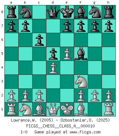 Last move : 1-0 2007 January 20 6:47:37 [Event "FICGS__CHESS__CLASS_A__000010"] [Site "FICGS"] [Date "2006.12.06"] [Round "1"] [White "Lowrance,Wayne"] [Black "Ozbostanlar,Ozgur"] [Result "1-0"] [WhiteElo "2005"] [BlackElo "2025"] 1.e4 c6 2.d4 d5 3.e5 Bf5 4.Nf3 1-0 This chess game has been lost on time (started : 2006.12.06 23:1:9) Caro-Kann : Advance variation Player White won this chess game. Follow this game move after move (download)An attack on the wing should be met by play in the center. (Nimzovitch) Garry Kasparov war erst in der Großmeister-Organisation GMA, dann in der Profischach-Vereinigung PCA, zum Schluss kehrte er wieder in den Schoß der FIDE zurück. Aber gut, manche Leute sind flexibel (Viswanathan Anand) Por esta medida (el intervalo entre Fischer y sus contemporaneos), yo le considero el mas grande campeón mundial. (Garry Kasparov) Les ravages du H expliquent la différence de niveau entre Tal et Thal [Abergel]. I take risks, sometimes patients die, but not taking risks causes more patients to die. So I guess my biggest problem is I've been cursed with the ability to do the math. (Gregory House, House M.D.)