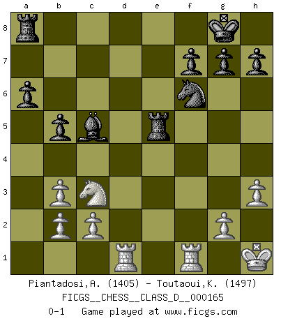 Last move : 0-1 2011 April 3 22:18:42 [Event "FICGS__CHESS__CLASS_D__000165"] [Site "FICGS"] [Date "2011.02.20"] [Round "1"] [White "Piantadosi,Angelo"] [Black "Toutaoui,Khaled"] [Result "0-1"] [WhiteElo "1405"] [BlackElo "1497"] 1.e4 c5 2.Nf3 Nc6 3.d4 cxd4 4.Nxd4 Nf6 5.Nc3 d6 6.Bc4 e6 7.O-O Be7 8.f4 O-O 9.Be3 a6 10.f5 Nxd4 11.Bxd4 b5 12.Bb3 Bd7 13.fxe6 Bxe6 14.h3 Re8 15.e5 dxe5 16.Bxe5 Bxb3 17.axb3 Bc5+ 18.Kh1 Qxd1 19.Raxd1 Rxe5 0-1 Sicilian defense Kingside Castling by player White (move 7) Kingside Castling by player Black (move 8) Player Black won this chess game. Follow this game move after move (download)A chess genius has died; a loss for humanity. (Viktor Kortchnoi, about Bobby Fischer's death) Ich bin der einzige Schachspieler, der sich während der Vorbereitungen zum Turnier verletzt hat. (Woody Allen) Cuando veas una buena jugada, trata de encontrar otra mejor. (Emanuel Lasker) Toutes les manuvres exécutées sur une colonne ouverte ont pour but ultime l'intrusion définitive sur la septième ou la huitième rangée, en plein cur de la position ennemie. (Aaron Nimzovitch) Perception is reality. (Immanuel Kant)