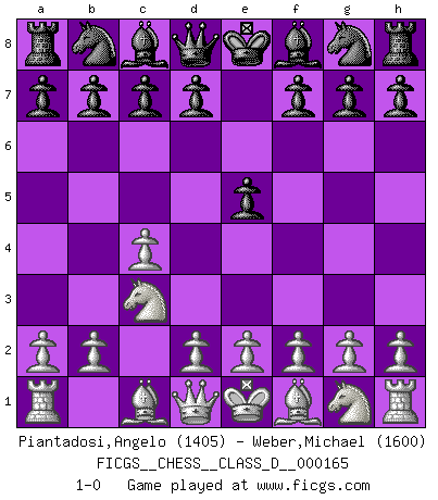 Last move : 1-0 2011 April 3 2:36:51 [Event "FICGS__CHESS__CLASS_D__000165"] [Site "FICGS"] [Date "2011.02.20"] [Round "1"] [White "Piantadosi,Angelo"] [Black "Weber,Michael"] [Result "1-0"] [WhiteElo "1405"] [BlackElo "1600"] 1.c4 e5 2.Nc3 1-0 This chess game has been lost on time (started : 2011.02.20 12:44:12) English Opening Player White won this chess game. Follow this game move after move (download)The beauty of a move lies not in its' appearance but in the thought behind it. (Siegbert Tarrasch) Es ist peinlich, dass ich nie Weltmeister wurde. Es wäre leicht, Leonid Breschnjew als Ursache vorzuschieben, dessen Apparat den Vorzeigekommunisten Anatoli Karpow in allem unterstützte. Aber Garri Kasparow zum Beispiel, der ebenfalls von den Sowjets unerwünscht war, hat trotz der Widerstände den WM-Titel erobert. (Viktor Kortschnoi) Si no le temes a Spassky, entonces elimino el elemento del dinero. (Jim Slater) Seul un grand joueur sait à quel point il joue faiblement. (Xavier Tartacover) Before all elsed, be armed. (Niccolo Machiavelli)