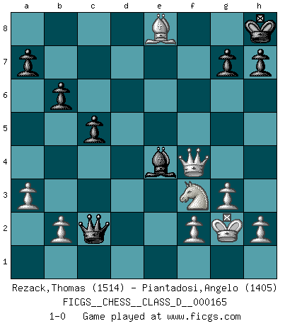 Last move : 1-0 2011 April 28 0:48:18 [Event "FICGS__CHESS__CLASS_D__000165"] [Site "FICGS"] [Date "2011.02.20"] [Round "1"] [White "Rezack,Thomas"] [Black "Piantadosi,Angelo"] [Result "1-0"] [WhiteElo "1514"] [BlackElo "1405"] 1.e4 d5 2.exd5 Qxd5 3.Nc3 Qd8 4.Bc4 e6 5.Nf3 Nf6 6.d4 c5 7.Be3 Nbd7 8.Qd3 Be7 9.Rd1 Qc7 10.d5 exd5 11.Nxd5 Nxd5 12.Qxd5 O-O 13.O-O Nf6 14.Qd2 Rd8 15.Qc3 Bf5 16.Qb3 Ng4 17.Rfe1 Bd6 18.g3 Nxe3 19.Rxe3 Re8 20.Rxe8+ Rxe8 21.Rxd6 Qxd6 22.Bxf7+ Kh8 23.Bxe8 Qd1+ 24.Kg2 Be4 25.Qe3 Qxc2 26.a3 b6 27.Qf4 1-0 Scandinavian (centre counter) defense Kingside Castling by player Black (move 12) Kingside Castling by player White (move 13) Player White won this chess game. Follow this game move after move (download)A sacrifice is best refuted by accepting it. (Wilhelm Steinitz) Der Umstand, daß uns eine 7 Stunden Zeitkontrolle ermöglicht eine großartige, tiefe Partie zu spielen, ist für die Massenmedien nicht weiter von Bedeutung. (Alexej Shirov) Prefiero perder una partida realmente buena, que ganar una mala. (David Levy) Dans le domaine de la peinture, de la gravure et de la sculpture, dès la première décennie de notre siècle, les artistes abandonnent la représentation de la partie d'échecs pour se concentrer sur les pièces, sur les échiquiers et sur toutes les variations auxquelles les unes et les autres peuvent donner lieu. On passe en quelque sorte d'un thème social à un thème musical (au sens de la musica médiévale, c'est-à-dire d'une notion qui inclue le rythme, l'harmonie, la construction et la déconstruction, etc.). Graphiquement et picturalement, l'échiquier apparaît comme une structure ouverte, dynamique, d'une richesse infinie, autorisant toutes les combinatoires et débouchant sur des mouvements et des rythmes de nature exponentielle. (Michel Pastoureau) There are 10 types of people in this world: those who understand binary and those who don't. (Anonymous)