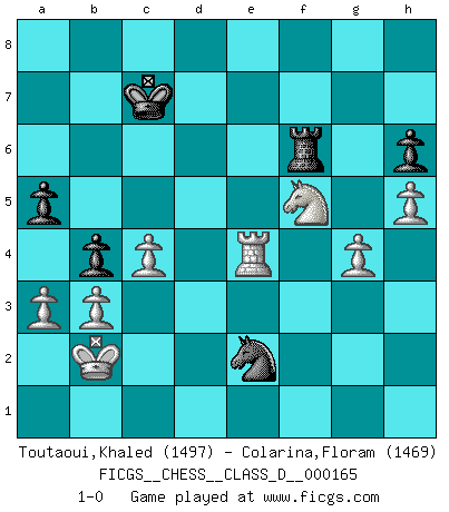 Last move : 1-0 2011 November 24 1:29:58 [Event "FICGS__CHESS__CLASS_D__000165"] [Site "FICGS"] [Date "2011.02.20"] [Round "1"] [White "Toutaoui,Khaled"] [Black "Colarina,Floram"] [Result "1-0"] [WhiteElo "1497"] [BlackElo "1469"] 1.e4 e5 2.Nf3 Nc6 3.d4 exd4 4.Nxd4 Nxd4 5.Qxd4 d6 6.Bc4 Qf6 7.Be3 Be7 8.Nd2 Qxd4 9.Bxd4 Bf6 10.c3 c5 11.Be3 Bd7 12.O-O-O Be6 13.f4 Ne7 14.Bxe6 fxe6 15.Nc4 d5 16.exd5 Nxd5 17.Nd6+ Kd7 18.Bxc5 b6 19.Ba3 Kc6 20.g3 Be7 21.Nc4 Bxa3 22.Nxa3 b5 23.Rhe1 Rhe8 24.Re2 a6 25.Rde1 Kd6 26.f5 e5 27.Nc2 a5 28.Nd4 b4 29.c4 Nc7 30.Nf3 e4 31.Rxe4 Rxe4 32.Rxe4 Rf8 33.Nh4 Rf6 34.g4 h6 35.Kc2 Na6 36.b3 Nc5 37.Rd4+ Kc6 38.Rd5 Kb6 39.Nf3 g6 40.Nh4 gxf5 41.Nxf5 Ne4 42.Rd4 Re6 43.Kb2 Kc7 44.a3 Nc3 45.h4 Rf6 46.h5 Ne2 47.Re4 1-0 Scotch game Queenside Castling by player White (move 12) Player White won this chess game. Follow this game move after move (download)Some part of a mistake is always correct. (Savielly Tartakover) Schach ist Kampf, hauptsächlich jedoch gegen die eigenen Fehler. (Savielly Grigorievitsch Tartakower) El Ajedrez se juega con la mente... ¡no con las manos!. (Renaud y Kahn) 'L'échange des dames est un coup dur pour les deux adversaires...' Un journaliste lors d'une partie du match Spassky-Fischer The only difference between a tax man and a taxidermist is that the taxidermist leaves the skin. (Mark Twain)