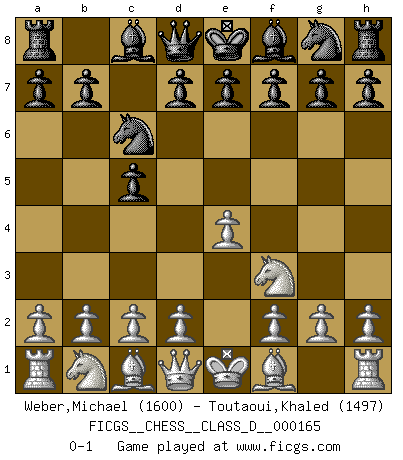 Last move : 0-1 2011 April 11 3:29:12 [Event "FICGS__CHESS__CLASS_D__000165"] [Site "FICGS"] [Date "2011.02.20"] [Round "1"] [White "Weber,Michael"] [Black "Toutaoui,Khaled"] [Result "0-1"] [WhiteElo "1600"] [BlackElo "1497"] 1.e4 c5 2.Nf3 Nc6 0-1 This chess game has been lost on time (started : 2011.02.20 12:44:12) Sicilian defense Player Black won this chess game. Follow this game move after move (download)Examine moves that smite! A good eye for smites is far more important than a knowledge of strategical principles. (Purdy) Ja, ich habe einmal eine Blitzpartie gespielt, es war in einem Zug, 1929. --im Interview 1989 (Mikhail Moiseyevich Botvinik) El Ajedrez te enseña a controlarl la excitación inicial que sientes cuando vez algo que parece bueno y te enseña a pensar objetivamente cuando te encuentras en problemas. (Stanley Kubrick) On entre au jeu d'Echecs comme on entre en Religion. Pour le joueur d'Echecs, la partie d'Echecs c'est l'office, la messe, le défilé du 1er Mai, le dépôt de gerbe au Monument aux Morts. C'est un drame sacré. (Michel Roos) Home computers are being called upon to perform many new functions, including the consumption of homework formerly eaten by the dog. (Doug Larson)