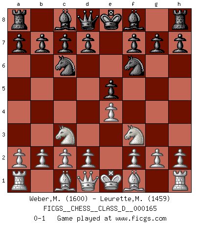 Last move : 0-1 2011 April 2 2:32:8 [Event "FICGS__CHESS__CLASS_D__000165"] [Site "FICGS"] [Date "2011.02.20"] [Round "1"] [White "Weber,Michael"] [Black "Leurette,Marc-Antoine"] [Result "0-1"] [WhiteElo "1600"] [BlackElo "1459"] 1.e4 e5 2.Nc3 Nf6 3.Nf3 Nc6 0-1 This chess game has been lost on time (started : 2011.02.20 12:44:12) Vienna : Falkbeer variation Player Black won this chess game. Follow this game move after move (download)Suddenly it was obvious to me in my analysis I had missed what Fischer had found with the greatest of ease at the board. (Mikhail Botvinnik) Wie kann ich Remis annehmen? Ich weiß ja gar nicht, wie ich stehe! (Fritz Sämisch) Cuando veas una buena jugada, trata de encontrar otra mejor. (Emanuel Lasker) Le jeu d'échecs est comme rejeté hors du temps. (Antoine de Saint-Exupéry) Creativity is allowing yourself to make mistakes. Art is knowing which ones to keep. (Scott Adams)