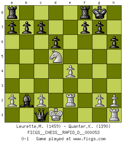 Last move : 0-1 2011 February 26 21:16:12 [Event "FICGS__CHESS__RAPID_D__000053"] [Site "FICGS"] [Date "2011.02.20"] [Round "1"] [White "Leurette,Marc-Antoine"] [Black "Quanter,Kirsty"] [Result "0-1"] [WhiteElo "1459"] [BlackElo "1390"] 1.e4 e5 2.Nf3 Nc6 3.Bc4 Bc5 4.Nc3 d6 5.d3 h6 6.Be3 Nf6 7.d4 exd4 8.Bxd4 Nxd4 9.Nxd4 O-O 10.Qd3 Ng4 11.Qe3 Nxe3 12.fxe3 Qg5 13.O-O-O Qxe3+ 14.Rd2 Bxd4 15.Nd5 Bxb2+ 16.Kd1 Bg4+ 17.Be2 Bxe2+ 18.Rxe2 Qc1+ 0-1 Giuoco Piano Kingside Castling by player Black (move 9) Queenside Castling by player White (move 13) Player Black won this chess game. Follow this game move after move (download)You must take your opponent into a deep dark forest where 2+2=5, and the path leading out is only wide enough for one. (Mikhail Tal) Ich tröste mich mit dem Vergnügen, daß Schachfans, Zuschauer und Leser glücklich sind, wenn ein Großmeister etwas riskiert, statt nur Klötzchen zu schieben. (Mikhail Nekhemyevich Tal) a manera como él juega al Ajedrez, demuestra la completa naturaleza de un hombre. (Stanley Ellin) La vie et les Echecs sont tous les deux une lutte constante. (Lasker) Perseverance does not equal worthiness. Next time you want to get my attention, wear something fun. Low-riding jeans are hot. (Gregory House, House M.D.)