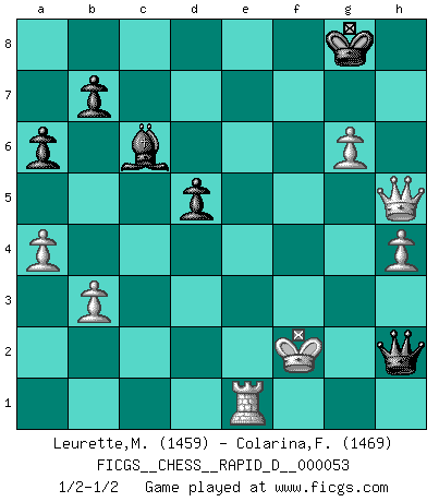 Last move : 1/2-1/2 2011 April 25 16:41:35 [Event "FICGS__CHESS__RAPID_D__000053"] [Site "FICGS"] [Date "2011.02.20"] [Round "1"] [White "Leurette,Marc-Antoine"] [Black "Colarina,Floram"] [Result "1/2-1/2"] [WhiteElo "1459"] [BlackElo "1469"] 1.e4 e6 2.d4 d5 3.Nc3 c6 4.exd5 cxd5 5.a3 Nc6 6.Nf3 Bd6 7.Bb5 Bd7 8.O-O Nf6 9.Re1 O-O 10.Bg5 a6 11.Bxc6 Bxc6 12.b3 Be7 13.Ne5 Be8 14.a4 Nd7 15.Bxe7 Qxe7 16.Ne2 f6 17.Nxd7 Bxd7 18.Nf4 Qd6 19.Qd2 Rac8 20.Rac1 g6 21.g3 Kg7 22.Qe3 Rfe8 23.h3 e5 24.dxe5 Rxe5 25.Qd4 Rxe1+ 26.Rxe1 Rxc2 27.h4 Bc6 28.g4 Qd7 29.g5 Kf8 30.Qxf6+ Kg8 31.Nxg6 hxg6 32.Qxg6+ Qg7 33.Qxc2 Qd4 34.Qg6+ Kh8 35.Qh5+ Kg8 36.g6 Qg7 37.f4 Qd4+ 38.Kh2 Qxf4+ 39.Kg1 Qg3+ 40.Kf1 Qh3+ 41.Kf2 Qh2+ 42.Kf1 Qh1+ 43.Kf2 Qh2+ 44.Kf1 Qh1+ 45.Kf2 Qh2+ 1/2-1/2 French : Paulsen variation Kingside Castling by player White (move 8) Kingside Castling by player Black (move 9) This chess game ended in a draw. Follow this game move after move (download)I play correspondence chess because it is both art and science while chess is art only. (A player at FICGS) Die Jungen erwarten, dass Opa einfach umfällt. Dann aber kann Opa fünf Stunden lang Schach spielen und die jungen Gegner an die Wand drücken. (Viktor Kortschnoi) El jugador de combinación piensa hacia adelante; comienza de la posición dada y trabaja las movidas contundentes en su mente. (Emanuel Lasker) Dans le domaine de la peinture, de la gravure et de la sculpture, dès la première décennie de notre siècle, les artistes abandonnent la représentation de la partie d'échecs pour se concentrer sur les pièces, sur les échiquiers et sur toutes les variations auxquelles les unes et les autres peuvent donner lieu. On passe en quelque sorte d'un thème social à un thème musical (au sens de la musica médiévale, c'est-à-dire d'une notion qui inclue le rythme, l'harmonie, la construction et la déconstruction, etc.). Graphiquement et picturalement, l'échiquier apparaît comme une structure ouverte, dynamique, d'une richesse infinie, autorisant toutes les combinatoires et débouchant sur des mouvements et des rythmes de nature exponentielle. (Michel Pastoureau) Imagination is more important than knowledge. Knowledge is limited. Imagination encircles the world. (Albert Einstein)