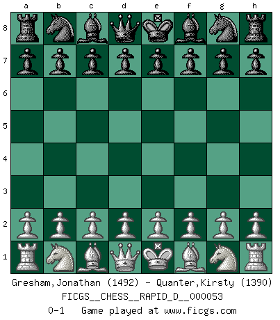 Last move : 0-1 2011 March 23 0:35:0 [Event "FICGS__CHESS__RAPID_D__000053"] [Site "FICGS"] [Date "2011.02.20"] [Round "1"] [White "Gresham,Jonathan"] [Black "Quanter,Kirsty"] [Result "0-1"] [WhiteElo "1492"] [BlackElo "1390"] 0-1 This chess game has been lost on time (started : 2011.02.20 14:52:12) Player Black won this chess game. Follow this game move after move (download)I feel as if I were a piece in a game of Chess, when my opponent says of it: That piece cannot be moved. (Soren Kierkegaard) Wenn du auf das Glück wartest, wird das Leben ziemlich langweilig. (Mikhail Nekhemyevich Tal) El pensamiento metódico es mas útil en el Ajedrez que la inspiración. (C. J. S. Purdy) En blitz, le Cavalier l'emporte sur le Fou. (Vlastimil Hort) All the biggest technological inventions created by man - the airplane, the automobile, the computer - says little about his intelligence, but speaks volumes about his laziness. (Mark Kennedy)