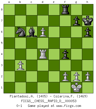 Last move : 0-1 2011 May 1 1:45:25 [Event "FICGS__CHESS__RAPID_D__000053"] [Site "FICGS"] [Date "2011.02.20"] [Round "1"] [White "Piantadosi,Angelo"] [Black "Colarina,Floram"] [Result "0-1"] [WhiteElo "1405"] [BlackElo "1469"] 1.e4 b6 2.Bc4 Bb7 3.Nc3 e6 4.d3 d5 5.exd5 exd5 6.Bb3 Nf6 7.Nf3 Bd6 8.O-O O-O 9.Re1 Nbd7 10.Bg5 c6 11.d4 a5 12.Nh4 h6 13.Be3 Ne4 14.Nxe4 dxe4 15.Qg4 Nf6 16.Qe2 a4 17.Bc4 b5 18.Bxb5 cxb5 19.Qxb5 Qd7 20.Qxd7 Nxd7 21.Nf5 Bc7 22.c4 Nb6 23.b3 Kh7 24.d5 Bc8 25.Ng3 f5 26.Ne2 f4 27.Bd4 Nd7 28.Nc3 axb3 29.axb3 Be5 30.Rxa8 Bxd4 31.Nxe4 Nb6 32.d6 Nxa8 33.c5 Bf5 34.c6 Nb6 35.Rd1 Bxe4 36.Rxd4 Bxc6 0-1 Owen defense Kingside Castling by player White (move 8) Kingside Castling by player Black (move 8) Player Black won this chess game. Follow this game move after move (download)A passed Pawn increases in strength as the number of pieces on the board diminishes. (Capablanca) Kasparov ist eine Art Monster mit hundert Augen, denen auch nicht das Geringste entgeht. (Tony Miles) Una de estas pequeñas movidas modestas pudieran ser mas molestas a tu oponente que la amenaza mas grande. (Siegbert Tarrasch) Aucun coup ne doit être joué sans but. (Pedro Damiano) However beautiful the strategy, you should occasionally look at the results. (Winston Churchill)