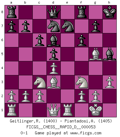 Last move : 0-1 2011 April 17 3:59:6 [Event "FICGS__CHESS__RAPID_D__000053"] [Site "FICGS"] [Date "2011.02.20"] [Round "1"] [White "Geitlinger,Roger"] [Black "Piantadosi,Angelo"] [Result "0-1"] [WhiteElo "1400"] [BlackElo "1405"] 1.e4 e6 2.d4 d5 3.exd5 exd5 4.Nc3 c6 5.Bd3 Bd6 6.Nf3 Ne7 7.O-O Bg4 8.h3 Bh5 9.Re1 O-O 10.Bxh7+ Kh8 11.Bd3 Nd7 12.Bg5 f6 0-1 This chess game has been lost on time (started : 2011.02.20 14:52:12) French : Exchange variation Kingside Castling by player White (move 7) Kingside Castling by player Black (move 9) Player Black won this chess game. Follow this game move after move (download)Adequate compensation for a sacrifice is having a sound combination leading to a winning position; adequate compensation for a blunder is having your opponent snatch defeat from the jaws of victory. (Bruce A. Moon) Kasparov stellt für gewöhnlich die Regeln auf und bricht sie dann selbst wieder. (Alexej Shirov) Cuando tengo las piezas blancas, yo gano porque soy blanco; Cuando tengo las piezas negras, yo gano porque soy Bogolyubov. (Bogolyubov) Tout change constamment, y compris dans le monde des Echecs. (Botvinnik) Pretend inferiority and encourage his arrogance. (Sun Tzu)