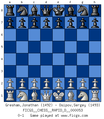 Last move : 0-1 2011 March 23 0:35:0 [Event "FICGS__CHESS__RAPID_D__000053"] [Site "FICGS"] [Date "2011.02.20"] [Round "1"] [White "Gresham,Jonathan"] [Black "Osipov,Sergey"] [Result "0-1"] [WhiteElo "1492"] [BlackElo "1493"] 0-1 This chess game has been lost on time (started : 2011.02.20 14:52:12) Player Black won this chess game. Follow this game move after move (download)Weak points or holes in the opponent's position must be occupied by pieces not Pawns. (Siegbert Tarrasch) Bogoljubow: Matt in vier Zügen! Tartakower: Ich verbitte mir jede Belästigung! (Savielly Grigorievitsch Tartakower) La caracteristica mas importante en la posición del Ajedrez es la actividad de las piezas. Esto es absolutamente fundamental en todas las fases del juego: Apertura, Juego Medio y especialmente Finales. La limitación primordial en la actividad de una pieza, es la estructuración de los Peones. (Michael Stean) On peut tirer plus d'utilité d'une partie perdue que de 100 parties gagnées. (Capablanca) Establishing goals is all right if you don't let them deprive you of interesting detours. (Doug Larson)