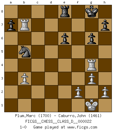 Last move : 1-0 2007 January 16 13:50:17 [Event "FICGS__CHESS__CLASS_D__000022"] [Site "FICGS"] [Date "2006.12.11"] [Round "1"] [White "Plum,Marc"] [Black "Caburro,John"] [Result "1-0"] [WhiteElo "1700"] [BlackElo "1461"] 1.e4 Nf6 2.e5 Nd5 3.d4 d6 4.Nf3 Bg4 5.Be2 e6 6.O-O Be7 7.c4 Nb6 8.Nc3 O-O 9.Be3 Nc6 10.exd6 cxd6 11.d5 Bxf3 12.Bxf3 Ne5 13.dxe6 Nxf3+ 14.Qxf3 fxe6 15.Qg4 Qd7 16.b3 Bf6 17.Rac1 Rad8 18.Ne4 Qf7 19.c5 dxc5 20.Bxc5 Rfe8 21.Nd6 Rxd6 22.Bxd6 Nd5 23.Rfe1 Qd7 24.Be5 Bxe5 25.Rxe5 Nf6 26.Qe2 Nd5 27.g3 Nb4 28.Rd1 Qc6 29.a3 Nc2 30.Qe4 Qxe4 31.Rxe4 Nxa3 32.Rd7 Nb5 33.Rg4 g6 34.Rxb7 1-0 Alekhine's defense : Modern variation, 4...Bg4 Kingside Castling by player White (move 6) Kingside Castling by player Black (move 8) Player White won this chess game. Follow this game move after move (download)Many have become Chess Masters, no one has become the Master of Chess. (Siegbert Tarrasch) Ein Remis kann durch Wiederholung von drei Zügen oder durch einen schlechte Zug erreicht werden. (Savielly Grigorievitsch Tartakower) Yo creo que el Ajedrez posee una magia que es también una ayuda en la edad avanzada. Una rodilla reumática es olvidada durante una partida de Ajedrez y otros eventos pueden parecer algo sin importancia comparada a una catástrofe en el tablero de Ajedrez. (Vlastimil Hort) Ce qui est bien, c'est d'avoir tout un tas de pièces en prise : l'adversaire ne peut en prendre qu'une à la fois. Cité par Thierry Audin. A computer lets you make more mistakes faster than any invention in human history - with the possible exceptions of handguns and tequila. (Mitch Ratcliffe)