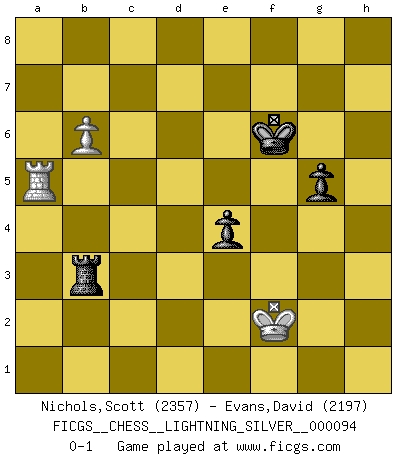 Last move : 0-1 2011 February 21 16:54:34 [Event "FICGS__CHESS__LIGHTNING_SILVER__000094"] [Site "FICGS"] [Date "2011.02.21"] [Round "1"] [White "Nichols,Scott"] [Black "Evans,David"] [Result "0-1"] [WhiteElo "2357"] [BlackElo "2197"] 1.Nf3 Nf6 2.c4 c5 3.Nc3 a6 4.e4 Nc6 5.d4 cxd4 6.Nxd4 e5 7.Nf5 d6 8.Ne3 Be7 9.Bd3 O-O 10.O-O Nd4 11.Ned5 Nxd5 12.Nxd5 Bg5 13.Be3 Bxe3 14.fxe3 Ne6 15.b4 a5 16.a3 Bd7 17.Qc2 Bc6 18.Rac1 Qg5 19.Qf2 Kh8 20.Rfd1 Qd8 21.Ra1 b6 22.Rf1 Qb8 23.Qh4 f6 24.b5 Be8 25.Be2 Nc5 26.Bg4 Qd8 27.Bh3 Ra7 28.Rac1 Bf7 29.Rcd1 Rg8 30.Qg4 Be6 31.Qf3 Bxh3 32.Qxh3 Nxe4 33.Qh4 Nc5 34.Rf3 Ne6 35.Qg4 Ng5 36.Rg3 Re8 37.Qf5 Rb7 38.Rf1 Rg8 39.h4 Nf7 40.Qc2 Qc8 41.a4 Rf8 42.Rgf3 Qg4 43.Rh3 Nd8 44.Kh2 f5 45.Rhf3 g6 46.h5 Ne6 47.hxg6 hxg6 48.Rh3+ Kg7 49.R1f3 Qg5 50.Rfg3 Qd8 51.Rh5 Rh8 52.Rxh8 Qxh8+ 53.Rh3 Qd8 54.Qf2 Nc5 55.Kg1 Ne4 56.Qe2 Rb8 57.Qc2 Qc8 58.Qe2 Qg8 59.Qd1 Ng5 60.Rh4 Qd8 61.g3 Qc8 62.Kg2 Qc5 63.Qe2 Qa3 64.g4 Rf8 65.gxf5 Rxf5 66.Ne7 Rf3 67.Qc2 e4 68.Nd5 Qa1 69.Qe2 Rf8 70.Rh1 Qe5 71.Qd2 Nf3 72.Qc3 Qxc3 73.Nxc3 Nd2 74.Nd5 Nxc4 75.Rd1 Rf3 76.Rd4 Nxe3+ 77.Nxe3 Rxe3 78.Rxd6 Ra3 79.Rxb6 Rxa4 80.Ra6 Ra3 81.b6 Rb3 82.Kf2 g5 83.Rxa5 Kf6 0-1 Reti Opening Kingside Castling by player Black (move 9) Kingside Castling by player White (move 10) 10 pieces endgame at move 78 : White KRPP , Black KRPPPP WHITE : King + 1 Rook 2 Pawns BLACK : King + 1 Rook 4 Pawns 9 pieces endgame at move 79 : White KRPP , Black KRPPP WHITE : King + 1 Rook 2 Pawns BLACK : King + 1 Rook 3 Pawns 8 pieces endgame at move 79 : White KRP , Black KRPPP WHITE : King + 1 Rook 1 Pawn BLACK : King + 1 Rook 3 Pawns 7 pieces endgame at move 83 : White KRP , Black KRPP WHITE : King + 1 Rook 1 Pawn BLACK : King + 1 Rook 2 Pawns Player Black won this chess game. Follow this game move after move (download)The game of Chess is not merely an idle amusement; several very valuable qualities of the mind are to be acquired and strengthened by it, so as to become habits ready on all occasions; for life is a kind of Chess. (Benjamin Franklin) Ich habe Kasparov in Rente geschickt. (Veselin Topalov) La belleza de un movimiento no se refleja solo en su apariencia, sino en el pensamiento detrás de él. (Siegbert Tarrasch) Je ne crois pas en la psychologie, je crois aux bons coups. (Robert Fischer) A bird doesn't sing because it has an answer, it sings because it has a song. (Maya Angelou)