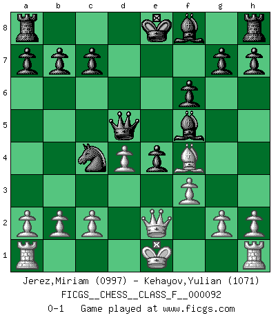 Last move : 0-1 2011 May 23 6:44:5 [Event "FICGS__CHESS__CLASS_F__000092"] [Site "FICGS"] [Date "2011.02.21"] [Round "1"] [White "Jerez,Miriam"] [Black "Kehayov,Yulian"] [Result "0-1"] [WhiteElo "0997"] [BlackElo "1071"] 1.e4 e5 2.Nf3 Nc6 3.Nc3 Nf6 4.Bc4 Nxe4 5.Nxe4 d5 6.Nxe5 Nxe5 7.d4 Nxc4 8.Bg5 f6 9.Qe2 dxe4 10.Bf4 Qd5 11.f3 Bf5 0-1 This chess game has been lost on time (started : 2011.02.21 22:7:28) Four knights : Italian variation Player Black won this chess game. Follow this game move after move (download)Chess is in its essence a game, in its form an art, and in its execution a science. (Baron Tassilo) Bogoljubow: Matt in vier Zügen! Tartakower: Ich verbitte mir jede Belästigung! (Savielly Grigorievitsch Tartakower) Muchos se han convertido en Maestros de Ajedrez, nadie se ha convertido en el Maestro del Ajedrez. (Siegbert Tarrasch) Je fais ceci parce que dans cinquante coups j'obtiendrai cela; je m'appelle Mikhail Moisevitch Botvinnik. (Botvinnik) For to win one hundred victories in one hundred battles is not the acme of skill. To subdue the enemy without fighting is the acme of skill. (Sun Tzu)