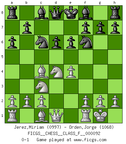 Last move : 0-1 2011 April 15 15:46:11 [Event "FICGS__CHESS__CLASS_F__000092"] [Site "FICGS"] [Date "2011.02.21"] [Round "1"] [White "Jerez,Miriam"] [Black "Orden,Jorge"] [Result "0-1"] [WhiteElo "0997"] [BlackElo "1068"] 1.e4 c5 2.Nf3 d6 3.d4 cxd4 4.Nxd4 Nf6 5.Bc4 a6 6.Nc3 e6 7.O-O Nc6 0-1 This chess game has been lost on time (started : 2011.02.21 22:7:28) Sicilian Kingside Castling by player White (move 7) Player Black won this chess game. Follow this game move after move (download)The passion for playing Chess is one of the most unaccountable in the world. (H.G. Wells) Bis zum Jahr 1971 verlief in meiner Schachkariere alles glatt. Dieses dramatische Match [Fischer-Taimanov 6:0] machte mein Leben zur Hölle. (Mark Taimanov) El juego del Ajedrez no es solamente una diversión quieta; algunas cualidades muy valuables de la mente se pueden adquirir y cultivar con el, como convertirlos en habitos disponibles para toda ocasión; ya que la vida es algo así como el Ajedrez. (Benjamin Franklin) La conception d'un plan est le processus par lequel un joueur exploite les avantages de sa position tout en s'efforçant d'en réduire au minimum les inconvénients. Afin de garantir le succès, un plan doit toujours se fonder sur un diagnostic objectif des particularités d'une position. La conception d'un plan est d'autant plus difficile que la position est équilibrée, et grandement facilitée lorsqu'il n'existe qu'un seul plan susceptible de répondre aux exigences de la position. (Harry Golombek) The mind is like a parachute, it only functions when its open. (Unknown)