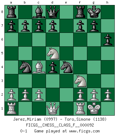 Last move : 0-1 2011 April 11 15:28:36 [Event "FICGS__CHESS__CLASS_F__000092"] [Site "FICGS"] [Date "2011.02.21"] [Round "1"] [White "Jerez,Miriam"] [Black "Toro,Simone"] [Result "0-1"] [WhiteElo "0997"] [BlackElo "1138"] 1.e4 e5 2.Nf3 Nc6 3.Nc3 Nf6 4.d4 Bb4 5.Bd2 O-O 6.Bc4 h6 7.O-O exd4 8.Nd5 Nxe4 9.Bxb4 Nxb4 0-1 This chess game has been lost on time (started : 2011.02.21 22:7:28) Four knights : Scotch variation Kingside Castling by player Black (move 5) Kingside Castling by player White (move 7) Player Black won this chess game. Follow this game move after move (download)Avoid the crowd. Do your own thinking independently. Be the Chess player, not the Chess piece. (Ralph Charell) Modernes Schach erfordert enorme Anspannung. Es ist für einen normalen Menschen unmöglich das auszuhalten. (Viktor Kortschnoi) Algunos sacrificios son sólidos, los demás son míos. (Mikhail Tal) Des points faibles ou des trous dans la position de l'adversaire doivent être occupés par des pièces et non pas par des pions. (Siegbert Tarrasch) If computers get too powerful, we can organize them into committees. That'll do them in. (Anonymous)