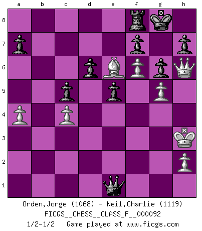 Last move : 1/2-1/2 2011 April 1 16:48:49 [Event "FICGS__CHESS__CLASS_F__000092"] [Site "FICGS"] [Date "2011.02.21"] [Round "1"] [White "Orden,Jorge"] [Black "Neil,Charlie"] [Result "1/2-1/2"] [WhiteElo "1068"] [BlackElo "1119"] 1.e4 c5 2.Nf3 Nc6 3.d4 cxd4 4.Nxd4 Nf6 5.Nc3 e6 6.Be2 Bb4 7.Nxc6 Bxc3+ 8.bxc3 bxc6 9.Bd3 e5 10.O-O d6 11.Be3 Be6 12.c4 O-O 13.c3 c5 14.f4 Rb8 15.f5 Bd7 16.g4 Ne8 17.g5 g6 18.f6 Qc8 19.a4 Bh3 20.Rf3 Bg4 21.Qf1 Bxf3 22.Qxf3 Nc7 23.Qh3 Ne6 24.Qh6 Rb2 25.Bf1 Qc6 26.Bh3 Qxe4 27.Bf2 Rxf2 28.Kxf2 Qc2+ 29.Kg1 Qxc3 30.Bxe6 Qxa1+ 31.Kg2 Qb2+ 32.Kg3 Qc3+ 33.Kh4 Qe1+ 34.Kh3 1/2-1/2 Sicilian defense Kingside Castling by player White (move 10) Kingside Castling by player Black (move 12) This chess game ended in a draw. Follow this game move after move (download)It is no time to be playing Chess when the house is on fire. (Italian Proverb) Ein Großmeister muß tausende Partien in seinem Kopf speichern, denn diese sind für Ihn, was die Worte der Muttersprache für gewöhnliche Leute sind, oder Noten für Musiker... (Garry Kasparov) Debes de llevar a tu oponente hacia un profundo y obscuro bosque donde 2+2=5, y el camino que conduce a la salida es suficientemente ancho para solamente uno. (Mikhail Tal) Le génie consiste à savoir transgresser les règles au moment opportun. (Teichmann) Lottery : A tax on people who are bad at math. (Author unknown)