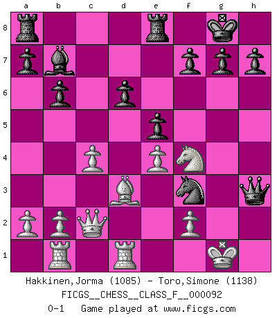 Last move : 0-1 2011 February 28 12:14:29 [Event "FICGS__CHESS__CLASS_F__000092"] [Site "FICGS"] [Date "2011.02.21"] [Round "1"] [White "Hakkinen,Jorma"] [Black "Toro,Simone"] [Result "0-1"] [WhiteElo "1085"] [BlackElo "1138"] 1.d4 Nf6 2.c4 c5 3.Nf3 cxd4 4.Nxd4 e5 5.Nf3 Nc6 6.Nc3 d6 7.e4 Be7 8.Bg5 O-O 9.Bd3 Re8 10.O-O b6 11.Rc1 Bb7 12.Qe2 Nd4 13.Qe3 Ng4 14.Qd2 Nxf3+ 15.gxf3 Bxg5 16.Qc2 Bf4 17.Rb1 Qh4 18.Rfd1 Nxh2 19.Ne2 Qh3 20.Nxf4 Nxf3+ 0-1 Benoni defense Kingside Castling by player Black (move 8) Kingside Castling by player White (move 10) Player Black won this chess game. Follow this game move after move (download)Do you realize Fischer almost never has any bad pieces? He exchanges them, and the bad pieces remain with his opponents. (Yuri Balashov) Wenn Spassky eine Figur opfert kannst du genauso gut aufgeben. Aber wenn Tal eine Figur opfert, spiel weiter. Er könnte noch eine weitere opfern, und dann ... wer weiß? (Miguel Najdorf) Bendita sea la memoria de aquel que dio al mundo este juego inmortal. (A. G. Gardiner) On n'a jamais que l'âge auquel on a commence à jouer aux échecs car après on cesse de vieillir. (Capablanca) Are you threatening me, Master Jedi ? (Chancellor Palpatine in Star Wars ep.3)