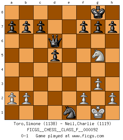 Last move : 0-1 2011 March 7 7:52:52 [Event "FICGS__CHESS__CLASS_F__000092"] [Site "FICGS"] [Date "2011.02.21"] [Round "1"] [White "Toro,Simone"] [Black "Neil,Charlie"] [Result "0-1"] [WhiteElo "1138"] [BlackElo "1119"] 1.d4 Nf6 2.c4 Nc6 3.Nf3 e6 4.Nc3 Bb4 5.Bd2 O-O 6.e4 Bxc3 7.Bxc3 Nxe4 8.Qc2 Nxc3 9.Qxc3 d5 10.cxd5 exd5 11.Be2 Re8 12.O-O Rxe2 13.Rfe1 Rxe1+ 14.Rxe1 Be6 15.Re3 Qd6 16.Qe1 Re8 17.Ng5 Nxd4 18.g3 Nc2 19.Rxe6 Rxe6 20.Qb1 Re1+ 21.Qxe1 Nxe1 0-1 Kevitz-Trajkovich defense Kingside Castling by player Black (move 5) Kingside Castling by player White (move 12) Player Black won this chess game. Follow this game move after move (download)The older I grow, the more I value pawns. (Paul Keres) Rauchen ist dem Schachspieler bei seiner Arbeit, also im Wettkampf, untersagt. (Viktor Kortschnoi) Robert Fischer es la ley hacia si mismo. (Larry Evans) Si rien de grave n'est détecté lors de l'analyse d'une position, on joue alors le coup. Seconde règle de Blumenfeld. Beta. Software undergoes beta testing shortly before it's released. Beta is latin for still doesn't work. (Anonymous)