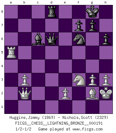 Last move : 1/2-1/2 2011 February 22 17:45:5 [Event "FICGS__CHESS__LIGHTNING_BRONZE__000191"] [Site "FICGS"] [Date "2011.02.22"] [Round "1"] [White "Huggins,Jimmy"] [Black "Nichols,Scott"] [Result "1/2-1/2"] [WhiteElo "1869"] [BlackElo "2329"] 1.Nf3 d5 2.g3 Nf6 3.Bg2 c6 4.O-O Bg4 5.c4 e6 6.Qb3 Qb6 7.Qc2 Nbd7 8.b3 Be7 9.Bb2 O-O 10.d3 h6 11.Nbd2 Rad8 12.Rae1 Rfe8 13.h3 Bf5 14.Bc3 Bh7 15.a3 Bxa3 16.Ra1 Bb4 17.Bxb4 Qxb4 18.Rxa7 e5 19.cxd5 cxd5 20.Qb2 e4 21.dxe4 dxe4 22.Nd4 e3 23.fxe3 Rxe3 24.Rxb7 Qd6 25.Rf3 Rxf3 26.N4xf3 Nc5 27.Rb5 Nce4 28.Nxe4 Bxe4 29.Kh2 Bc6 30.Ra5 1/2-1/2 Reti : King's Indian attack, Yugoslav variation Kingside Castling by player White (move 4) Kingside Castling by player Black (move 9) This chess game ended in a draw. Follow this game move after move (download)I have never in my life played the French Defence, which is the dullest of all openings. (Wilhelm Steinitz) Vom Schach wurde gesagt das Leben sei dafür nicht lange genug. Aber das ist der Fehler des Lebens, nicht des Schach'. (Irving Chernev) Aquellos que dicen que entienden al Ajedrez, no entienden nada. (Robert Hubner) J'ai vu le vaincu d'Echecs jouer des années durant dans l'espoir de la fête de la victoire. Car tu es plus riche de ce qu'elle existe si même elle n'est point pour toi. Ainsi de la perle du fond des mers. (Antoine de Saint-Exupéry) I don't diet. I just don't eat as much as I'd like to. (Linda Evangelista, supermodel)