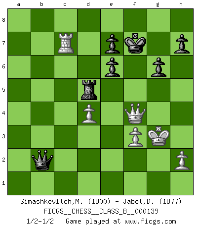 Last move : 1/2-1/2 2011 October 2 9:29:17 [Event "FICGS__CHESS__CLASS_B__000139"] [Site "FICGS"] [Date "2011.02.22"] [Round "1"] [White "Simashkevitch,Mykola"] [Black "Jabot,Daniel"] [Result "1/2-1/2"] [WhiteElo "1800"] [BlackElo "1877"] 1.e4 c5 2.Nf3 d6 3.d4 cxd4 4.Nxd4 Nf6 5.Nc3 g6 6.Be3 Bg7 7.f3 Nbd7 8.Qd2 a6 9.g4 b5 10.g5 Nh5 11.a4 bxa4 12.Rxa4 O-O 13.Be2 Nc5 14.Ra3 Bd7 15.b4 Ne6 16.Nxe6 fxe6 17.O-O Qc7 18.Bd3 Rac8 19.Na4 Bxa4 20.Rxa4 Bc3 21.Qc1 d5 22.Bxa6 Rcd8 23.exd5 Rxd5 24.Bd3 Be5 25.Qd2 Bf4 26.Kh1 Qe5 27.Bxf4 Nxf4 28.Ra5 Qxg5 29.Rxd5 Qxd5 30.b5 Rf5 31.b6 Nxd3 32.cxd3 Qb5 33.Qe3 Re5 34.Qd4 Rd5 35.Qe3 Rd6 36.Rc1 Rxb6 37.Rc8+ Kg7 38.Rc7 Kf7 39.Kg2 Qb2+ 40.Kg3 Rb5 41.d4 Rd5 42.Qf4+ 1/2-1/2 Sicilian : Dragon, Yugoslav attack Kingside Castling by player Black (move 12) Kingside Castling by player White (move 17) This chess game ended in a draw. Follow this game move after move (download)Man is a frivolous, a specious creature, and like a Chess player, cares more for the process of attaining his goal than for the goal itself. (Dostoyevsky) Ich trinke, ich rauche, ich spiele, ich liebe Frauen aber Fernschach ist ein Laster, das ich nicht habe. (Mikhail Nekhemyevich Tal) El Ajedrez es un regaderazo frío para la mente. (Sir John Simon) Le joueur d'Echecs qui veut atteindre le top est obligé de développer son propre credo créatif. Alexeï Stepanovicth Souétine. Il est facile d'écrire des livres ! Ce qui est difficile, c'est de jouer ! (Alexeï Stepanovicth Souétine) If passion drives you, let reason holds the reins. (Benjamin Franklin)