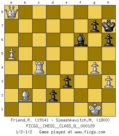 Last move : 1/2-1/2 2011 March 19 11:4:0 [Event "FICGS__CHESS__CLASS_B__000139"] [Site "FICGS"] [Date "2011.02.22"] [Round "1"] [White "Friend,Reuben"] [Black "Simashkevitch,Mykola"] [Result "1/2-1/2"] [WhiteElo "1914"] [BlackElo "1800"] 1.e4 e5 2.Bc4 Nf6 3.d3 Nc6 4.Nc3 Na5 5.Qf3 Nxc4 6.dxc4 d6 7.h3 Be6 8.b3 c6 9.Nge2 a6 10.a4 Be7 11.O-O O-O 12.a5 d5 13.exd5 cxd5 14.Rd1 d4 15.Qxb7 Bf5 16.Ra2 h6 17.Ng3 Bh7 18.f3 Rb8 19.Qc6 Qc8 20.Qxc8 Rbxc8 21.Nce4 Nxe4 22.Nxe4 Bxe4 23.fxe4 f5 24.exf5 Rxf5 25.Rf1 Rcf8 26.Rxf5 Rxf5 27.Ra1 e4 28.Bb2 Bf6 29.b4 e3 30.g4 Rf2 31.b5 Rxc2 32.bxa6 Rxc4 33.Rc1 d3 34.a7 d2 35.a8Q+ Kh7 36.Rxc4 1/2-1/2 Bishop's Opening : Berlin defense Kingside Castling by player White (move 11) Kingside Castling by player Black (move 11) Promotion Queen by player White (move 35) This chess game ended in a draw. Follow this game move after move (download)Chess is like war on a board. (Bobby Fischer) Ich kämpfe solange mein Gegner einen Fehler machen kann. (Emanuel Lasker) Fischer era un maestro de claridad y un Rey del posicionamiento astuto. Sus oponentes podían ver hacia donde se dirigía pero eran impotentes para detenerlo. (Bruce Pandolfini) Il n'y a pas eu de défaite parce que je ne crois pas que cet ordinateur ait jamais existé. IBM a triché en refusant d'imprimer les modes de recherche de la machine. C'est évident, pendant le match, des coups décisifs ont été joués par des êtres humains. Aujourd'hui, les meilleurs spécialistes en informatique ne peuvent toujours pas expliquer comment Deep-Blue a pu jouer contre la logique des ordinateurs. IBM a gagné une guerre de communication, mais ils sont incapables de prouver que l'ordinateur a gagné tout seul. (Garry Kasparov) Those who make the worst use of their time are the first to complain of its brevity. (Jean de la Bruyere)