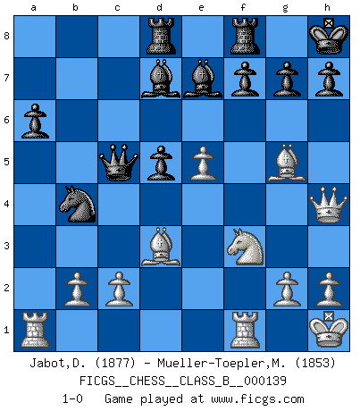 Last move : 1-0 2011 September 1 11:53:33 [Event "FICGS__CHESS__CLASS_B__000139"] [Site "FICGS"] [Date "2011.02.22"] [Round "1"] [White "Jabot,Daniel"] [Black "Mueller-Toepler,Michael"] [Result "1-0"] [WhiteElo "1877"] [BlackElo "1853"] 1.e4 c5 2.Nf3 Nc6 3.d4 cxd4 4.Nxd4 e6 5.Nc3 Qc7 6.Be2 a6 7.O-O Nf6 8.Be3 d6 9.f4 Be7 10.Kh1 Bd7 11.Qe1 O-O 12.Qg3 Kh8 13.a3 b5 14.Bd3 Rad8 15.Nf3 b4 16.axb4 Nxb4 17.e5 dxe5 18.fxe5 Nfd5 19.Nxd5 exd5 20.Bg5 Qc5 21.Qh4 1-0 Sicilian defense Kingside Castling by player White (move 7) Kingside Castling by player Black (move 11) Player White won this chess game. Follow this game move after move (download)I am the best player in the world and I am here to prove it. (Bobby Fischer) Das ganze Leben mit einer Ehefrau ist wie ein Endspiel mit ungleichfarbigen Läufern. (Viktor Kortschnoi) Botvinnik trató de alejar el misterio referente al Ajedrez, siempre relacionandolo a situaciones de la vida diaria. Solía llamar al Ajedrez un problema inexacto típico, similar a aquellos en que la gente tiene siempre que resolver a cada día. (Garry Kasparov) Les réformistes prétendent que les progrès de la théorie conduiront à la disparition des échecs, et qu'il faut, pour leur rendre vie, en remanier les règles. En réalité, qu'exprime cette affirmation? Le mépris de l'intuition, de l'imagination et de tous les autres éléments qui font des échecs un art. (Alexander Alekhine) Wipe them out. All of them. (Darth Sidious in Star Wars ep.1)