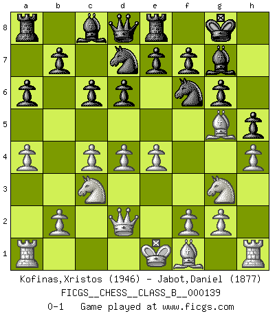 Last move : 0-1 2011 May 14 6:10:7 [Event "FICGS__CHESS__CLASS_B__000139"] [Site "FICGS"] [Date "2011.02.22"] [Round "1"] [White "Kofinas,Xristos"] [Black "Jabot,Daniel"] [Result "0-1"] [WhiteElo "1946"] [BlackElo "1877"] 1.d4 Nf6 2.c4 g6 3.Nc3 Bg7 4.e4 d6 5.Nge2 c6 6.Ng3 Nbd7 7.h4 h5 8.Bg5 a6 9.a4 O-O 10.Qd2 Re8 0-1 King's Indian : Kramer system Kingside Castling by player Black (move 9) Player Black won this chess game. Follow this game move after move (download)Chess is above all, a fight ! (Emanuel Lasker) Stil? Ich habe keinen Stil! (Anatoly Karpov) La mitad de las variaciones que son calculadas en una partida de torneo, resultan ser completamente superfluas. Desafortunadamente, nadie sabe por adelantado cual mitad. (Jan Tinman) Dieu déplace le joueur, et celui-ci la pièce. Quel Dieu derrière Dieu commence donc la trame ? Arturo Perez-Reverte (prix de littérature policière 1993). Do you know these so called Volunteers don't even get paid! (Simpsons)