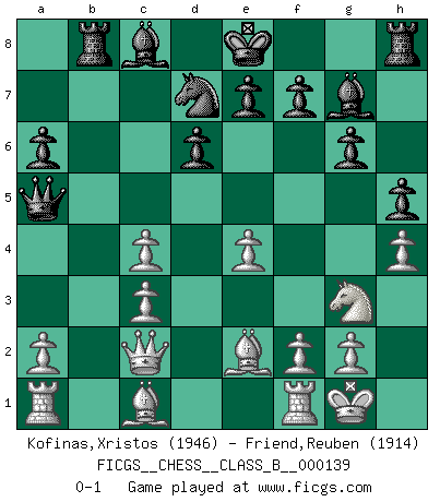 Last move : 0-1 2011 May 14 6:10:7 [Event "FICGS__CHESS__CLASS_B__000139"] [Site "FICGS"] [Date "2011.02.22"] [Round "1"] [White "Kofinas,Xristos"] [Black "Friend,Reuben"] [Result "0-1"] [WhiteElo "1946"] [BlackElo "1914"] 1.d4 Nf6 2.c4 g6 3.Nc3 Bg7 4.e4 d6 5.Nge2 c6 6.Ng3 a6 7.Be2 b5 8.O-O Nbd7 9.d5 b4 10.dxc6 bxc3 11.cxd7+ Nxd7 12.bxc3 h5 13.h4 Rb8 14.Qc2 Qa5 0-1 King's Indian : Kramer system Kingside Castling by player White (move 8) Player Black won this chess game. Follow this game move after move (download)Up to this point White has been following well-known analysis. But now he makes a fatal error: he begins to use his own head. (Siegbert Tarrasch) Jeder Fehler erscheint unglaublich dumm, wenn andre ihn begehen. (Georg Christoph Lichtenberg) Ser exitoso en el Ajedrez te permite descubrir tu propia personalidad. Eso es lo que deseo para los niños de mi clase. (Saudin Robovic) Toutes choses étant égales, c'est la conviction qui gagne. Alliée à une volonté de vaincre, elle sert de détonateur, suscite des idées, disperse les doutes et aide à penser clairement. (Robert Fischer) Real knowledge is to know the extent of one's ignorance. (Confucius)