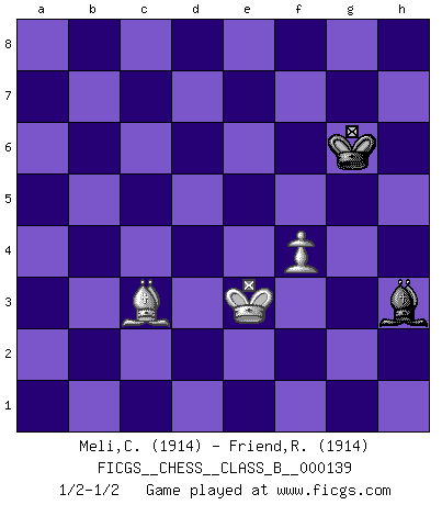 Last move : 1/2-1/2 2011 April 9 14:14:46 [Event "FICGS__CHESS__CLASS_B__000139"] [Site "FICGS"] [Date "2011.02.22"] [Round "1"] [White "Meli,Cosimo Leonardo"] [Black "Friend,Reuben"] [Result "1/2-1/2"] [WhiteElo "1914"] [BlackElo "1914"] 1.d4 Nf6 2.h3 c5 3.d5 b5 4.Nf3 e6 5.dxe6 fxe6 6.Nbd2 d5 7.a4 bxa4 8.c3 c4 9.Qxa4+ Bd7 10.Qd1 Nc6 11.e4 Bc5 12.b4 cxb3 13.exd5 exd5 14.Nxb3 Bb6 15.Be2 O-O 16.O-O a5 17.Nbd4 Ne4 18.Qb3 Kh8 19.Bb2 Bxd4 20.cxd4 Bf5 21.Ba3 Rb8 22.Qe3 Re8 23.Ne5 Nxe5 24.dxe5 d4 25.Qf4 Qd7 26.Bg4 Bxg4 27.Qxe4 Bh5 28.Qf4 Qd5 29.Rfc1 Rb5 30.Rc7 Qxe5 31.Qxe5 Rbxe5 32.Bb2 R5e7 33.Rxe7 Rxe7 34.Bxd4 Kg8 35.Rxa5 Be2 36.Be5 Kf7 37.f4 Rb7 38.Kf2 Bc4 39.Rc5 Be6 40.Ke3 h5 41.Kf3 Rb3+ 42.Kf2 Rd3 43.Ke2 Rd5 44.Rc3 h4 45.Ke3 Rd7 46.Ra3 Bd5 47.Kf2 Ke6 48.g4 hxg3+ 49.Rxg3 Be4 50.Rxg7 Rxg7 51.Bxg7 Kf7 52.Be5 Kg6 53.Ke3 Bf5 54.Bc3 Bxh3 1/2-1/2 Queen's pawn game Kingside Castling by player Black (move 15) Kingside Castling by player White (move 16) 10 pieces endgame at move 48 : White KRBPP , Black KRBPP WHITE : King + 1 Rook 1 Bishop 2 Pawns BLACK : King + 1 Rook 1 Bishop 2 Pawns 9 pieces endgame at move 49 : White KRBPP , Black KRBP WHITE : King + 1 Rook 1 Bishop 2 Pawns BLACK : King + 1 Rook 1 Bishop 1 Pawn 8 pieces endgame at move 50 : White KRBPP , Black KRB WHITE : King + 1 Rook 1 Bishop 2 Pawns BLACK : King + 1 Rook 1 Bishop 7 pieces endgame at move 50 : White KBPP , Black KRB WHITE : King + 1 Bishop 2 Pawns BLACK : King + 1 Rook 1 Bishop 6 pieces endgame at move 51 : White KBPP , Black KB WHITE : King + 1 Bishop 2 Pawns BLACK : King + 1 Bishop 5 pieces endgame at move 54 : White KBP , Black KB WHITE : King + 1 Bishop 1 Pawn BLACK : King + 1 Bishop This chess game ended in a draw. Follow this game move after move (download)When I asked Fischer why he had not played a certain move in our game, he replied: 'Well, you laughed when I wrote it down !' (Mikhail Tal) Korrekt heißt in Deutschland die Haltung eines Mannes, dessen Benehmen nach dem Urteile seiner Nachbarn seiner Stellung angemessen ist. Um korrekt zu sein, muß man sich der Meinung der anderen anpassen... (Emanuel Lasker) El Ajedrez detiene a su maestro dentro de sus propios vínculos, encadenando la mente y el cerebro, por lo que la libertad interior del mas fuerte debe sufrir. (Albert Einstein) La menace est plus forte que l'exécution. (Aaron Nimzovitch) The question of whether computers can think is just like question of whether submarines can swim. (Edsger W. Dijkstra)