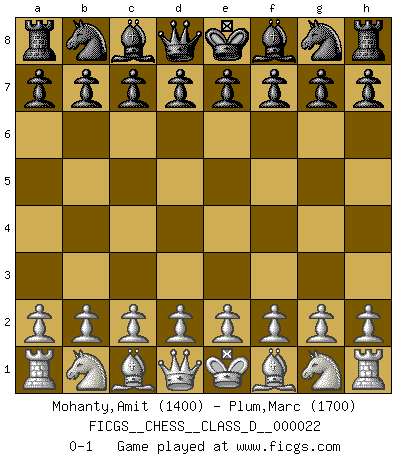 Last move : 0-1 2007 January 21 0:49:22 [Event "FICGS__CHESS__CLASS_D__000022"] [Site "FICGS"] [Date "2006.12.11"] [Round "1"] [White "Mohanty,Amit"] [Black "Plum,Marc"] [Result "0-1"] [WhiteElo "1400"] [BlackElo "1700"] 0-1 This chess game has been lost on time (started : 2006.12.11 20:7:37) Player Black won this chess game. Follow this game move after move (download)Fischer was a master of clarity and a king of artful positioning. His opponents would see where he was going but were powerless to stop him. (Bruce Pandolfini) Frage des Reporters: -Worin besteht das Ziel von Gambiteröffnungen? Antwort: -Auf Kosten der Partie einen Ruf als Angriffspieler zu erwerben.- (Siegbert Tarrasch) Tu eres para mi la Reina en d8 y yo soy el Peón en d7!!. (GM Eduard Gufeld) Vous savez, camarade Pachman, je n'éprouve pas de plaisir à être ministre, je jouerais plutôt aux échecs comme vous, ou alors ferais une révolution au Venezuela. (Che Guevara à Ludek Pachman, 'Checkmate in Prague', 1975) Internet: Absolute communication, absolute isolation. (Paul Carvel)