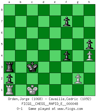 Last move : 0-1 2011 March 17 17:36:26 [Event "FICGS__CHESS__RAPID_E__000048"] [Site "FICGS"] [Date "2011.02.23"] [Round "1"] [White "Orden,Jorge"] [Black "Cavaille,Cedric"] [Result "0-1"] [WhiteElo "1068"] [BlackElo "1092"] 1.e4 c5 2.Nf3 d6 3.d4 cxd4 4.Nxd4 Nf6 5.Nc3 Nc6 6.Be2 Nxd4 7.Qxd4 e5 8.Qc4 Be6 9.Qb5+ Qd7 10.Qxd7+ Nxd7 11.Bb5 a6 12.Ba4 b5 13.Bb3 Nc5 14.O-O Nxb3 15.axb3 Be7 16.Be3 O-O 17.Rfd1 b4 18.Na4 a5 19.Nb6 Ra6 20.Nc4 Bxc4 21.bxc4 a4 22.f4 exf4 23.Bxf4 Rd8 24.e5 dxe5 25.Bxe5 Rxd1+ 26.Rxd1 Bf6 27.Bxf6 gxf6 28.c5 a3 29.bxa3 bxa3 30.Ra1 Kf8 31.Kf2 Ke7 32.Ke3 Kd7 33.Kd4 Kc6 34.Kc4 a2 35.Kb4 f5 36.c4 h5 37.h4 f4 38.Kb3 Kxc5 39.Kc3 Ra3+ 40.Kb2 Kb4 41.Kc2 Kxc4 42.Kd2 Kb3 43.Kc1 Kc3 0-1 Sicilian Kingside Castling by player White (move 14) Kingside Castling by player Black (move 16) 10 pieces endgame at move 41 : White KRPP , Black KRPPPP WHITE : King + 1 Rook 2 Pawns BLACK : King + 1 Rook 4 Pawns Player Black won this chess game. Follow this game move after move (download)Of Chess it has been said that life is not long enough for it, but that is the fault of life, not Chess. (William Ewart Napier) Computer sind die einzigen Gegner, die nicht immer eine Ausrede auf Lager haben, wenn sie gegen mich verlieren. (Robert James Fischer) No todos los artistas son jugadores de Ajedrez, pero todos los jugadores de Ajedrez son artistas. (Marcel Duchamp) Même si vous avez un bon coup à faire, regardez toujours s'il n'y en a pas un qui lui soit préférable. (Pedro Damiano) Somehow our devils are never quite what we expect when we meet them face to face. (Nelson DeMille)