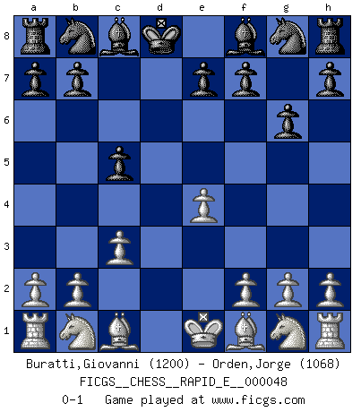 Last move : 0-1 2011 April 1 2:21:39 [Event "FICGS__CHESS__RAPID_E__000048"] [Site "FICGS"] [Date "2011.02.23"] [Round "1"] [White "Buratti,Giovanni"] [Black "Orden,Jorge"] [Result "0-1"] [WhiteElo "1200"] [BlackElo "1068"] 1.e4 c5 2.c3 d6 3.d4 g6 4.dxc5 dxc5 5.Qxd8+ Kxd8 0-1 This chess game has been lost on time (started : 2011.02.23 5:42:27) Sicilian : Alapin's variation (2.c3) Player Black won this chess game. Follow this game move after move (download)A good sacrifice is one that is not necessarily sound but leaves your opponent dazed and confused. (Rudolph Spielmann) Ihnen, Herr Lasker, habe ich nur drei Worte zu sagen: Schach und matt. (Siegbert Tarrasch) Un mal día en el Ajedrez, es mejor que cualquier buen día en el trabajo. (Anonymous) Les échecs sont utiles à l'exercice de la faculté de penser et à celle de l'imagination. Car nous devons posséder une méthode élaborée pour atteindre des buts partout où nous devons conduire notre raison. (Leibnitz) The faster the computer, the slower the brain. (Thibault de Vassal)