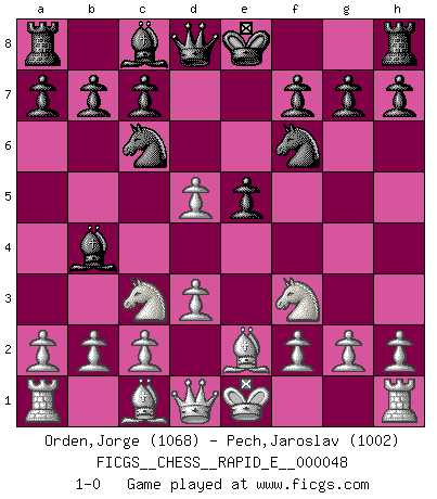 Last move : 1-0 2011 May 14 18:9:20 [Event "FICGS__CHESS__RAPID_E__000048"] [Site "FICGS"] [Date "2011.02.23"] [Round "1"] [White "Orden,Jorge"] [Black "Pech,Jaroslav"] [Result "1-0"] [WhiteElo "1068"] [BlackElo "1002"] 1.e4 Nf6 2.Nc3 e5 3.Nf3 Nc6 4.Be2 Bb4 5.d3 d5 6.exd5 1-0 This chess game has been lost on time (started : 2011.02.23 5:42:27) Alekhine's defense Player White won this chess game. Follow this game move after move (download)What is the difference between chess and football? Everybody understands football, but nobody plays it. Everybody plays chess, but nobody understands it. Everything is relative. (Vladimir Kramnik) Der Freibauer hat für mich eine Seele, genau wie der Mensch, Wünsche, die unerkannt in ihm schlummern, und Befürchtungen, von deren Existenz er selbst kaum ahnt. (Aaron Nimzowitsch) Los Peones son el alma de una partida de Ajedrez. (Francois Andre Danican Philidor) Les réformistes prétendent que les progrès de la théorie conduiront à la disparition des échecs, et qu'il faut, pour leur rendre vie, en remanier les règles. En réalité, qu'exprime cette affirmation? Le mépris de l'intuition, de l'imagination et de tous les autres éléments qui font des échecs un art. (Alexander Alekhine) A good book on your shelf is a friend that turns its back on you and remains a friend. (Author unknown)