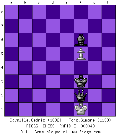 Last move : 0-1 2011 March 22 4:26:23 [Event "FICGS__CHESS__RAPID_E__000048"] [Site "FICGS"] [Date "2011.02.23"] [Round "1"] [White "Cavaille,Cedric"] [Black "Toro,Simone"] [Result "0-1"] [WhiteElo "1092"] [BlackElo "1138"] 1.e4 e5 2.Nf3 Nc6 3.Bc4 Nf6 4.Nc3 g6 5.Ng5 d5 6.exd5 Nxd5 7.Nxd5 Be6 8.Nxe6 fxe6 9.Ne3 Qe7 10.b3 O-O-O 11.O-O Qf6 12.Qf3 Qxf3 13.gxf3 Rd6 14.d3 Nd4 15.Kg2 h5 16.Re1 h4 17.Bb2 h3+ 18.Kh1 Bh6 19.Bxd4 exd4 20.Ng4 Bf4 21.Bxe6+ Kb8 22.Bc4 Rc6 23.Re6 Rxe6 24.Bxe6 Re8 25.Bf7 Re2 26.Bxg6 Rxc2 27.Re1 b6 28.Ra1 Bd2 29.Bf5 Bc3 30.Rg1 Rxa2 31.Ne5 Rb2 32.Be4 c6 33.Bxc6 Rxb3 34.Bd7 a5 35.Bxh3 a4 36.Be6 Rb5 37.f4 a3 38.Kg2 Rb2 39.h4 a2 40.Nf3 Re2 41.Bxa2 Rxa2 42.h5 Kb7 43.h6 b5 44.h7 Ra8 45.Rh1 Rh8 46.Ne5 Bd2 47.Nf7 Rc8 48.h8Q Rxh8 49.Rxh8 Bxf4 50.Rh4 Bd2 51.Rxd4 Ka6 52.Ne5 Ka5 53.Kf1 Bc3 54.Ke2 Bxd4 55.f4 b4 56.Nc4+ Ka4 57.f5 b3 58.Kf3 Kb4 59.Ke4 Bh8 60.d4 Kxc4 61.d5 b2 62.d6 Bf6 63.d7 b1Q+ 64.Kf4 Qb8+ 65.Ke4 Qd6 66.Kf3 Qxd7 67.Kf4 Qd4+ 68.Kf3 Qe5 69.Kg4 Qe4+ 70.Kg3 Qh4+ 71.Kf3 Kd3 72.Kg2 Ke2 73.Kg1 Kf3 74.Kf1 Qf2+ 0-1 Two knights defense Queenside Castling by player Black (move 10) Kingside Castling by player White (move 11) Promotion Queen by player White (move 48) 10 pieces endgame at move 49 : White KRNPPP , Black KBPP WHITE : King + 1 Rook 1 Knight 3 Pawns BLACK : King + 1 Bishop 2 Pawns 9 pieces endgame at move 49 : White KRNPP , Black KBPP WHITE : King + 1 Rook 1 Knight 2 Pawns BLACK : King + 1 Bishop 2 Pawns 8 pieces endgame at move 51 : White KRNPP , Black KBP WHITE : King + 1 Rook 1 Knight 2 Pawns BLACK : King + 1 Bishop 1 Pawn 7 pieces endgame at move 54 : White KNPP , Black KBP WHITE : King + 1 Knight 2 Pawns BLACK : King + 1 Bishop 1 Pawn 6 pieces endgame at move 60 : White KPP , Black KBP WHITE : King + 2 Pawns BLACK : King + 1 Bishop 1 Pawn Promotion Queen by player Black (move 63) 5 pieces endgame at move 66 : White KP , Black KQB WHITE : King + 1 Pawn BLACK : King + 1 Queen 1 Bishop Player Black won this chess game. Follow this game move after move (download)The enormous mental resilience, without which no Chess player can exist, was so much taken up by Chess that he could never free his mind of this game. (Albert Einstein) Bis zum Jahr 1971 verlief in meiner Schachkariere alles glatt. Dieses dramatische Match [Fischer-Taimanov 6:0] machte mein Leben zur Hölle. (Mark Taimanov) No solamente yo pronostico su triunfo sobre Botvinnik, sino que me adelanto y digo que probablemente Fischer es el jugador de Ajedrez mas grande que haya existido. (John Collins) Ne tendez aucun piège pour le plaisir ! Ne jouez rien dans l'espoir que l'adversaire réagisse de façon stupide ! Prenez toujours pour acquis que l'adversaire va trouver le meilleur coup ! Ne jouez jamais de coup dans l'espoir que l'adversaire ne voie pas la menace ! Chacun de vos coups doit améliorer la position d'une façon ou d'une autre. There are three kinds of lies: lies, damned lies and statistics. (Mark Twain)