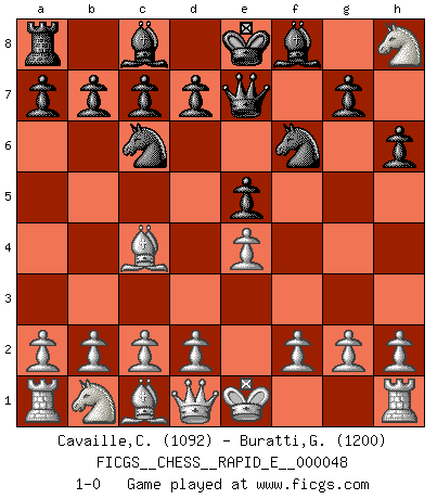Last move : 1-0 2011 March 31 14:7:46 [Event "FICGS__CHESS__RAPID_E__000048"] [Site "FICGS"] [Date "2011.02.23"] [Round "1"] [White "Cavaille,Cedric"] [Black "Buratti,Giovanni"] [Result "1-0"] [WhiteElo "1092"] [BlackElo "1200"] 1.e4 e5 2.Nf3 Nf6 3.Bc4 Nc6 4.Ng5 h6 5.Nxf7 Qe7 6.Nxh8 1-0 This chess game has been lost on time (started : 2011.02.23 5:42:27) Petrov : Italian variation Player White won this chess game. Follow this game move after move (download)Any material change in a position must come about by mate, a capture, or a Pawn promotion. (Purdy) Die Jungen erwarten, dass Opa einfach umfällt. Dann aber kann Opa fünf Stunden lang Schach spielen und die jungen Gegner an die Wand drücken. (Viktor Kortschnoi) En posiciones complicadas, Bobby Fischer pocas veces tuvo que temer de cualquiera. (Paul Keres) Le temps de noter son nom sur la feuille de partie, j'étais déjà en zeitnot ! D'un modeste amateur apparié lors de la première ronde d'un open contre le grand-maître Azmaïparashvili. A computer lets you make more mistakes faster than any invention in human history - with the possible exceptions of handguns and tequila. (Mitch Ratcliffe)