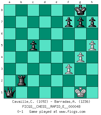 Last move : 0-1 2011 March 2 21:46:33 [Event "FICGS__CHESS__RAPID_E__000048"] [Site "FICGS"] [Date "2011.02.23"] [Round "1"] [White "Cavaille,Cedric"] [Black "Barradas,Anderson"] [Result "0-1"] [WhiteElo "1092"] [BlackElo "1236"] 1.e4 e5 2.Nf3 Nf6 3.Bc4 d5 4.exd5 Nxd5 5.Nxe5 Nc6 6.Nxc6 bxc6 7.Nc3 Be6 8.Nxd5 cxd5 9.Bd3 c5 10.b3 Rc8 11.O-O Bd6 12.c4 Be5 13.Rb1 dxc4 14.Be4 cxb3 15.axb3 O-O 16.Bb2 Bxb2 17.Rxb2 Qd4 18.Qc2 Rb8 19.Ra2 Bxb3 20.Qb1 Bxa2 21.Qxa2 Qxe4 22.Qa1 Rb7 23.Qe1 Rb4 24.Qxe4 Rxe4 25.f3 Rd4 26.Re1 Rxd2 27.Kf1 a5 28.Re2 Rfd8 29.Rxd2 Rxd2 30.h4 a4 31.g4 a3 32.Ke1 Rh2 33.Kf1 a2 34.Kg1 Rb2 35.h5 a1Q+ 0-1 Petrov : Italian variation Kingside Castling by player White (move 11) Kingside Castling by player Black (move 15) Promotion Queen by player Black (move 35) Player Black won this chess game. Follow this game move after move (download)I have never in my life played the French Defence, which is the dullest of all openings. (Wilhelm Steinitz) Es genügt nicht ein guter Spieler zu sein, man muß auch gut spielen. (Siegbert Tarrasch) El Ajedrez es parte de una cultura y si una cultura esta en decadencia, entonces también el Ajedrez declinará. (Mikhail Botvinnik) J'ai toujours senti une vague pitié pour l'homme qui ne connaît rien aux échecs, tout comme j'en aurais pour un homme ignorant de l'amour. Les Echecs, comme la musique ou comme l'amour, ont le pouvoir de rendre heureux. (Siegbert Tarrasch) Memory is a way of holding onto the things you love, the things you are, the things you never want to lose. (from the television show: The Wonder Years)