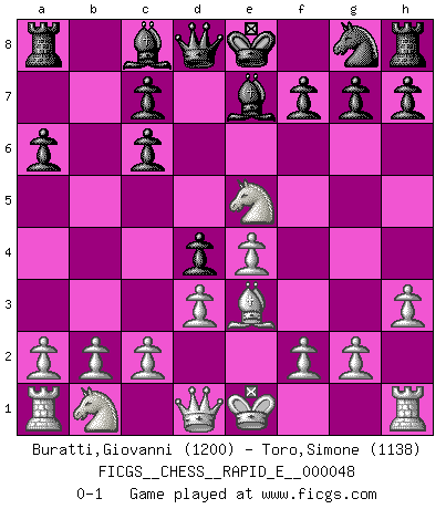 Last move : 0-1 2011 April 3 2:36:51 [Event "FICGS__CHESS__RAPID_E__000048"] [Site "FICGS"] [Date "2011.02.23"] [Round "1"] [White "Buratti,Giovanni"] [Black "Toro,Simone"] [Result "0-1"] [WhiteElo "1200"] [BlackElo "1138"] 1.e4 e5 2.Nf3 Nc6 3.Bb5 a6 4.Bxc6 bxc6 5.d3 d6 6.h3 Be7 7.Be3 d5 8.Nxe5 d4 0-1 This chess game has been lost on time (started : 2011.02.23 5:42:27) Ruy Lopez : Exchange variation Player Black won this chess game. Follow this game move after move (download)The laws of Chess do not permit a free choice: you have to move whether you like it or not. (Emanuel Lasker) Moralische Siege zählen nicht. (Savielly Grigorievitsch Tartakower) Solo el jugador con la iniciativa tiene el derecho a atacar. (Wilhelm Steinitz) Les Echecs, c'est l'art de la guerre sans les charniers, c'est la résurrection des morts tombés au champ d'honneur, l'espoir perpétuel, la suprématie de l'intelligence sur la force, la culture de l'esprit. (F. Szpiner) The real voyage of discovery consists not in seeking new lands but in seeing with new eyes. (Marcel Proust)