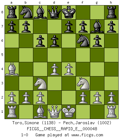 Last move : 1-0 2011 May 10 18:0:17 [Event "FICGS__CHESS__RAPID_E__000048"] [Site "FICGS"] [Date "2011.02.23"] [Round "1"] [White "Toro,Simone"] [Black "Pech,Jaroslav"] [Result "1-0"] [WhiteElo "1138"] [BlackElo "1002"] 1.e4 d6 2.d4 Nf6 3.Nc3 g6 4.Nf3 Bg7 5.Bb5+ c6 6.Ba4 1-0 This chess game has been lost on time (started : 2011.02.23 5:42:27) Pirc : Classical (Two knights) system Player White won this chess game. Follow this game move after move (download)I know people who have all the will in the world, but still can't play good Chess. (Bobby Fischer) Meine Liebe ist Schach, Schach, Schach. Ich muss jeden Tag Schach spielen, deshalb fühle ich mich so stark. (Miguel Najdorf) No soy una persona materialista y por eso, no resiento la falta o pérdida del dinero. La ausencia de cosas mundanas carece de importancia. Ya que el Ajedrez es una forma en la que puedo ser tan materialista como yo desee sin tener la necesidad de vender mi alma. (Jamie Walter Adams) On n'a jamais que l'âge auquel on a commence à jouer aux échecs car après on cesse de vieillir. (Capablanca) Men should grow up. - Yeah. And dogs should stop licking themselves. It's not gonna happen. (Gregory House to Dr. Cameron, House M.D.)