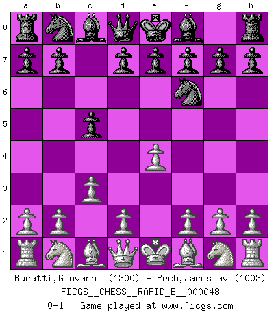 Last move : 0-1 2011 April 7 15:0:11 [Event "FICGS__CHESS__RAPID_E__000048"] [Site "FICGS"] [Date "2011.02.23"] [Round "1"] [White "Buratti,Giovanni"] [Black "Pech,Jaroslav"] [Result "0-1"] [WhiteElo "1200"] [BlackElo "1002"] 1.e4 c5 2.c3 Nf6 0-1 This chess game has been lost on time (started : 2011.02.23 5:42:27) Sicilian : Alapin's variation (2.c3) Player Black won this chess game. Follow this game move after move (download)A win by an unsound combination, however showy, fills me with artistic horror. (Wilhelm Steinitz) Wenn Dein Gegner dir ein Remis anbietet, versuch herauszufinden, weshalb er glaubt schlechter zu stehen. (Nigel Short) Tu eres para mi la Reina en d8 y yo soy el Peón en d7!!. (GM Eduard Gufeld) Le joueur d'Echecs qui veut atteindre le top est obligé de développer son propre credo créatif. Alexeï Stepanovicth Souétine. Il est facile d'écrire des livres ! Ce qui est difficile, c'est de jouer ! (Alexeï Stepanovicth Souétine) In fact if nothing is done against this teddy bear, hereby I announce that I would quit chess, rapid chess, blitz chess, postal chess, email chess, server chess and correspondence chess I will then switch to a table game where teddy bears aren't going to be seen for a while, like Poker, or Roulette, all 18+ games. (Elmer Valderrama)